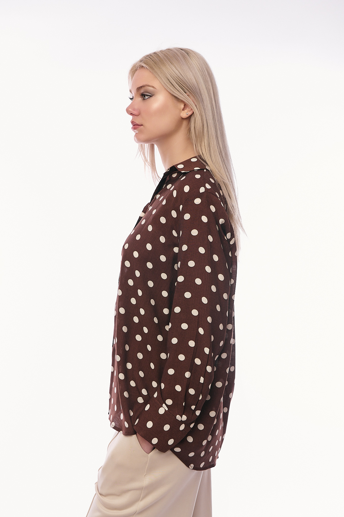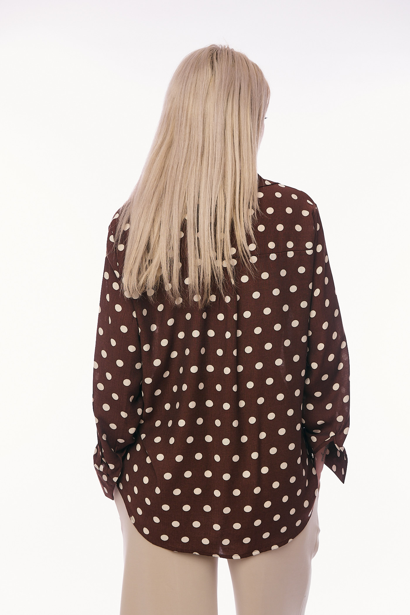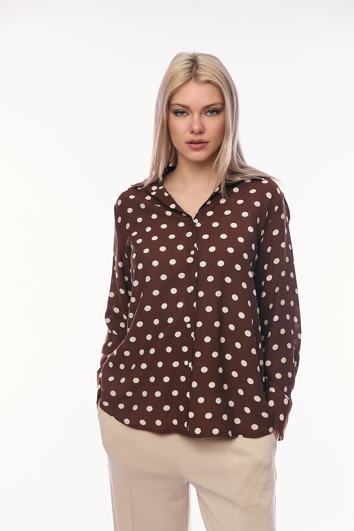 Γυναικείο Καφέ Πουκάμισο με Μεγάλο Πουά Σχέδιο και Μακριά Μανίκια σε Άνετη Γραμμή-C7009B