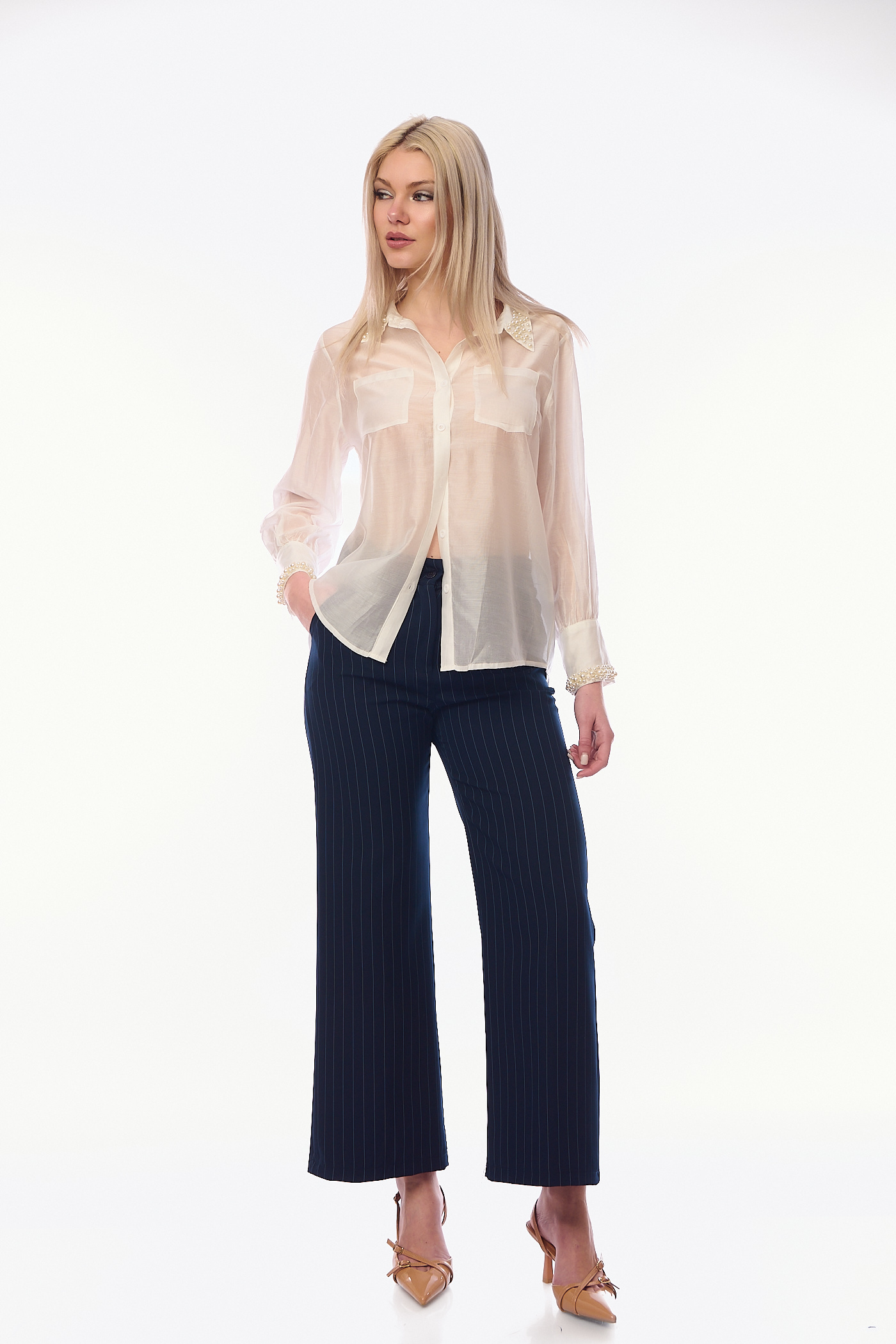 Η πολυτελής αίσθηση του φυσικού μεταξιού συναντά τη διαχρονική κομψότητα σε αυτό το λευκό ημιδιάφανο πουκάμισο, το οποίο ξεχωρίζει για την αριστοκρατική διακόσμηση από πέρλες που αγκαλιάζουν τον γιακά και τις μανσέτες, προσφέροντας μια διακριτική αλλά επιβλητική λάμψη. Το σχέδιο χαρακτηρίζεται από την αέρινη γραμμή του και τις δύο τσέπες στο στήθος που προσθέτουν μια σύγχρονη δομή, ενώ τα μακριά μανίκια με τον ελαφρύ όγκο καταλήγουν σε εντυπωσιακά τελειώματα που αναδεικνύουν τη θηλυκότητα σε κάθε κίνηση. Χάρη στην αιθέρια υφή του, αποτελεί το ιδανικό κομμάτι για layering πάνω από ένα silk camisole, δημιουργώντας ένα look υψηλής αισθητικής που μπορεί να σταθεί επάξια από μια σημαντική επαγγελματική συνάντηση μέχρι μια επίσημη κοινωνική εκδήλωση.