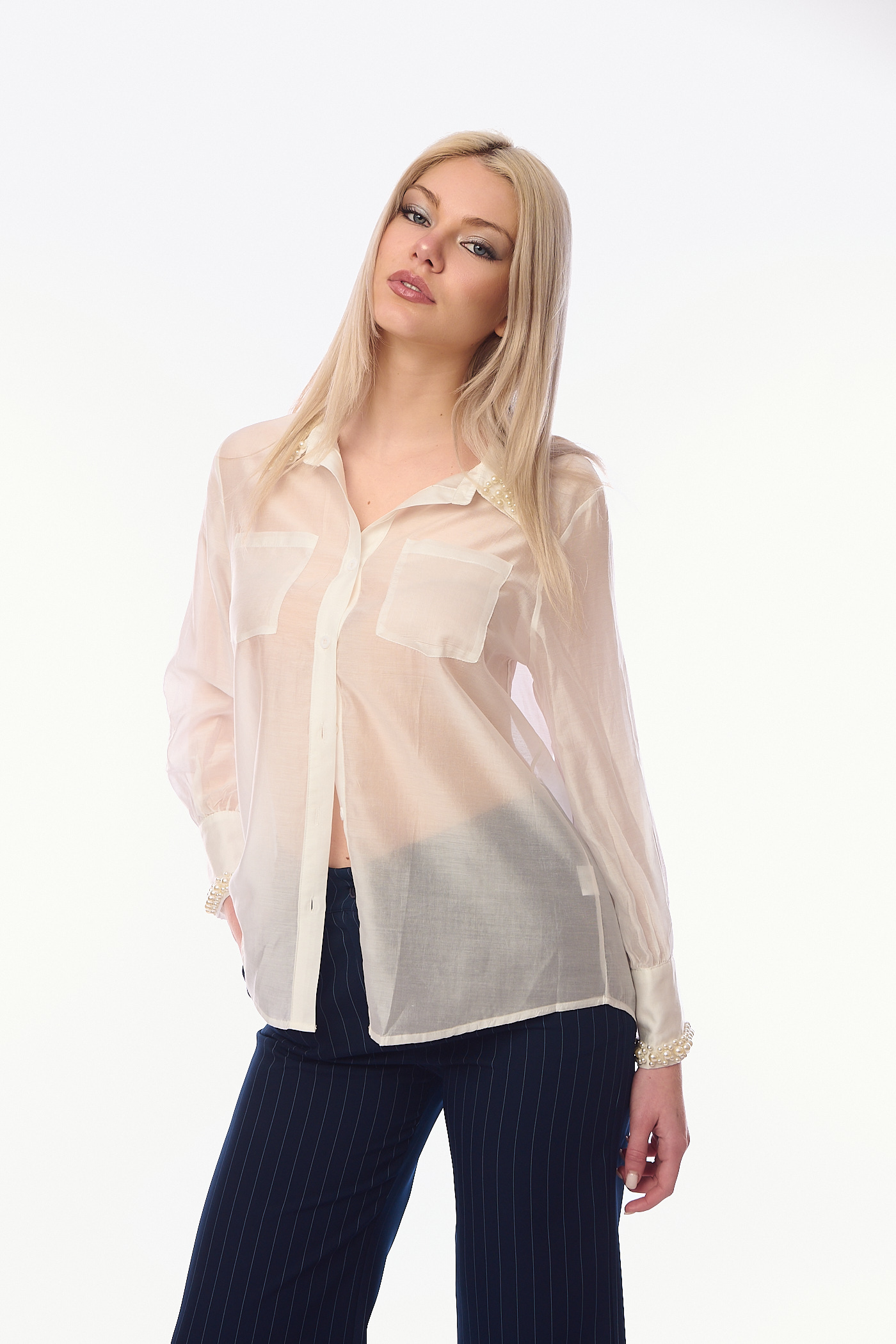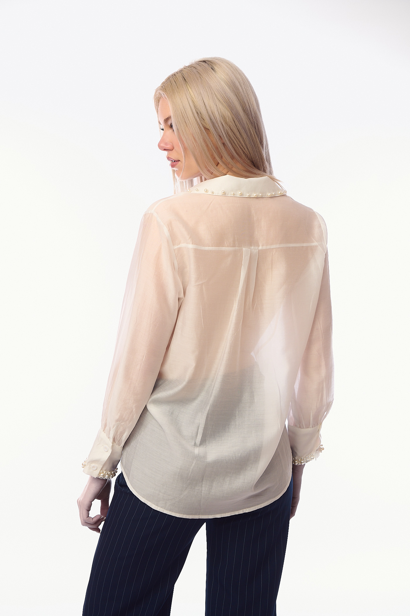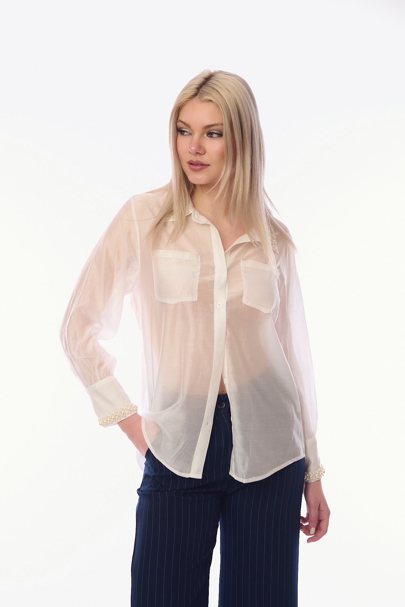 Γυναικείο Λευκό Μεταξωτό Πουκάμισο με Ημιδιάφανη Όψη και Διακόσμηση από Πέρλες στον Γιακά και τις Μανσέτες-G28523