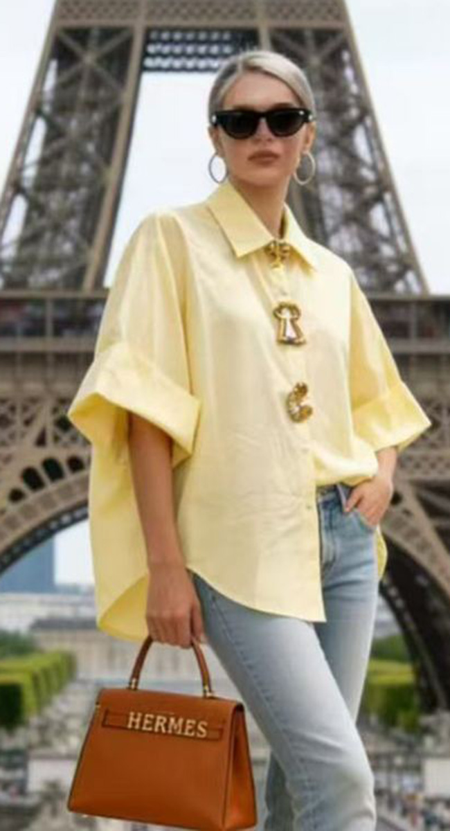 Οversized πουκάμισο σε απαλή κίτρινη,γαλάζια, λευκή η ροζ απόχρωση, το οποίο διακρίνεται για τα ιδιαίτερα statement κουμπιά του σε σχήμα κλειδαριάς και άλλων χρυσών διακοσμητικών στοιχείων. Τα μανίκια του πουκάμισου έχουν φαρδιά γραμμή και είναι γυρισμένα προς τα πάνω, ενισχύοντας την ανάλαφρη και ταυτόχρονα στιλάτη αισθητική του.