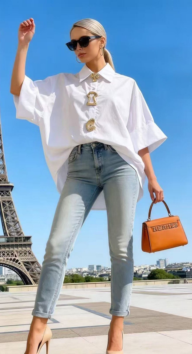 Το πουκάμισο συνδυάζεται άψογα με ένα κλασικό τζιν παντελόνι σε ανοιχτόχρωμη μπλε απόχρωση.