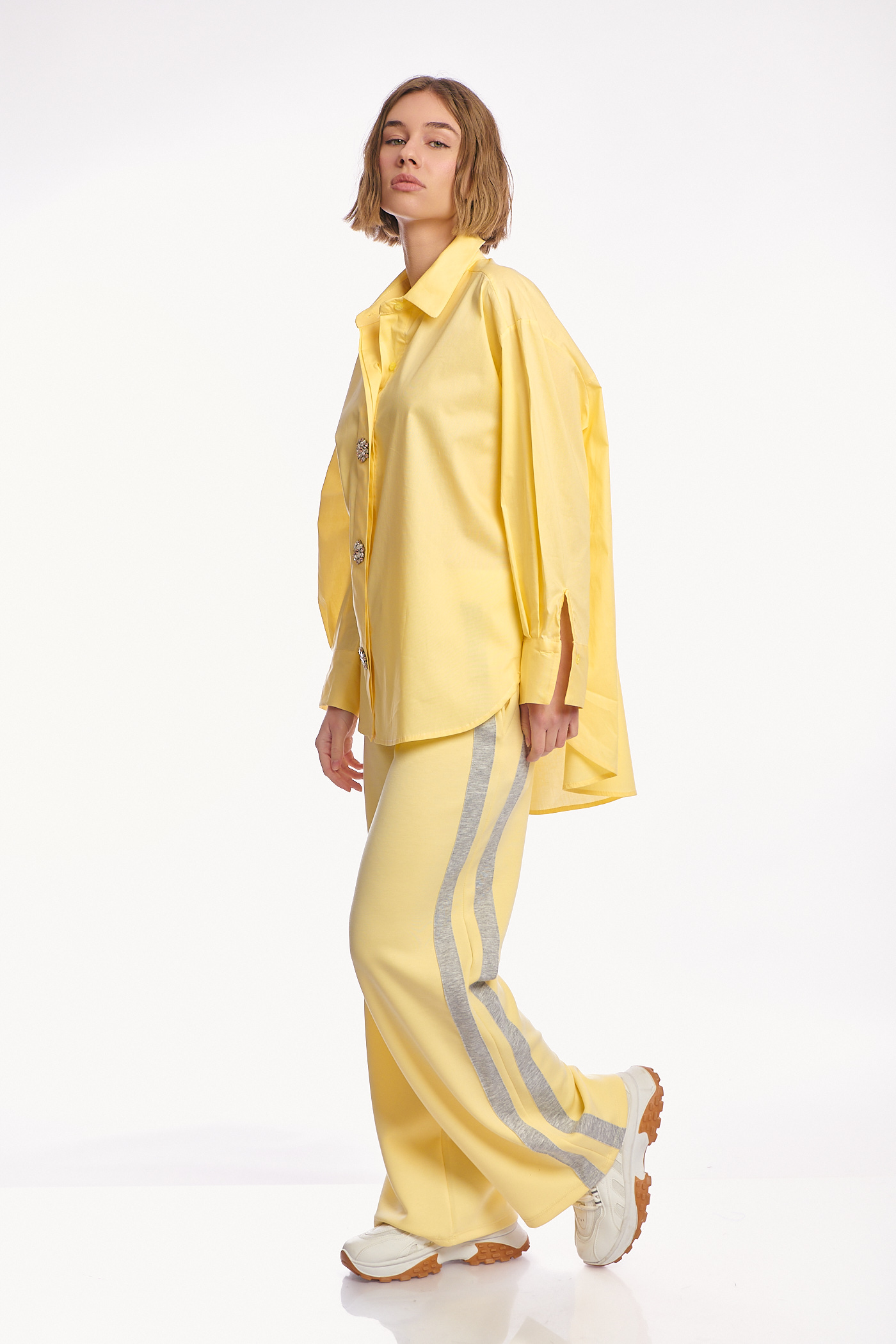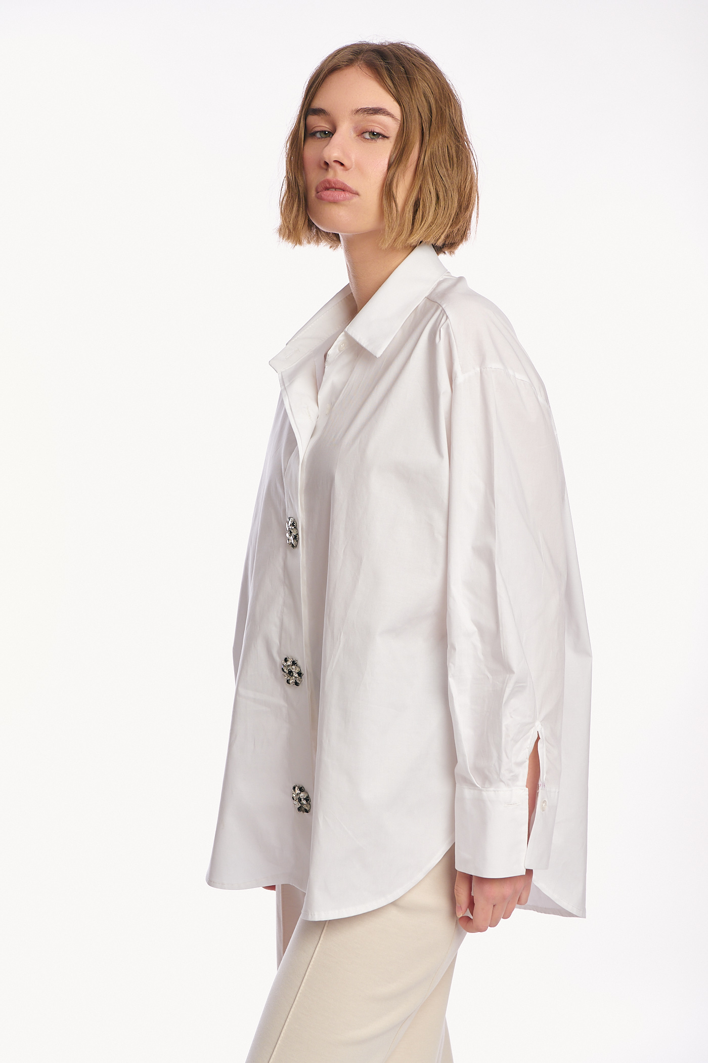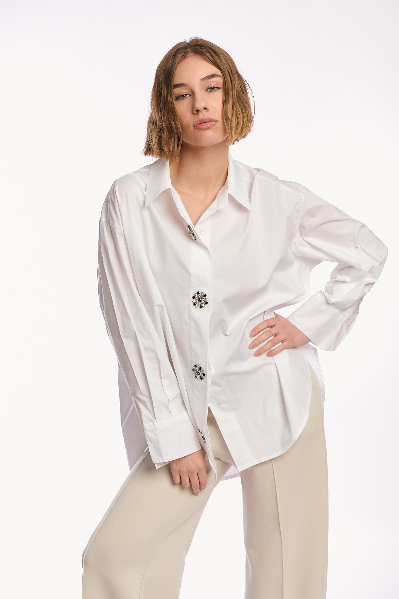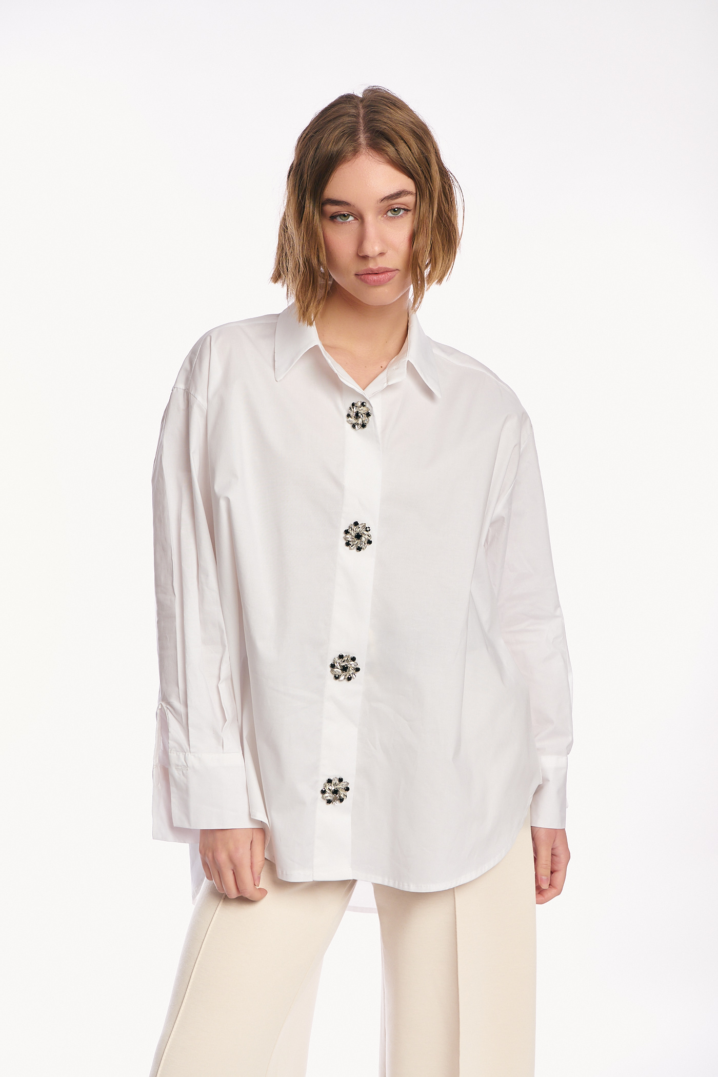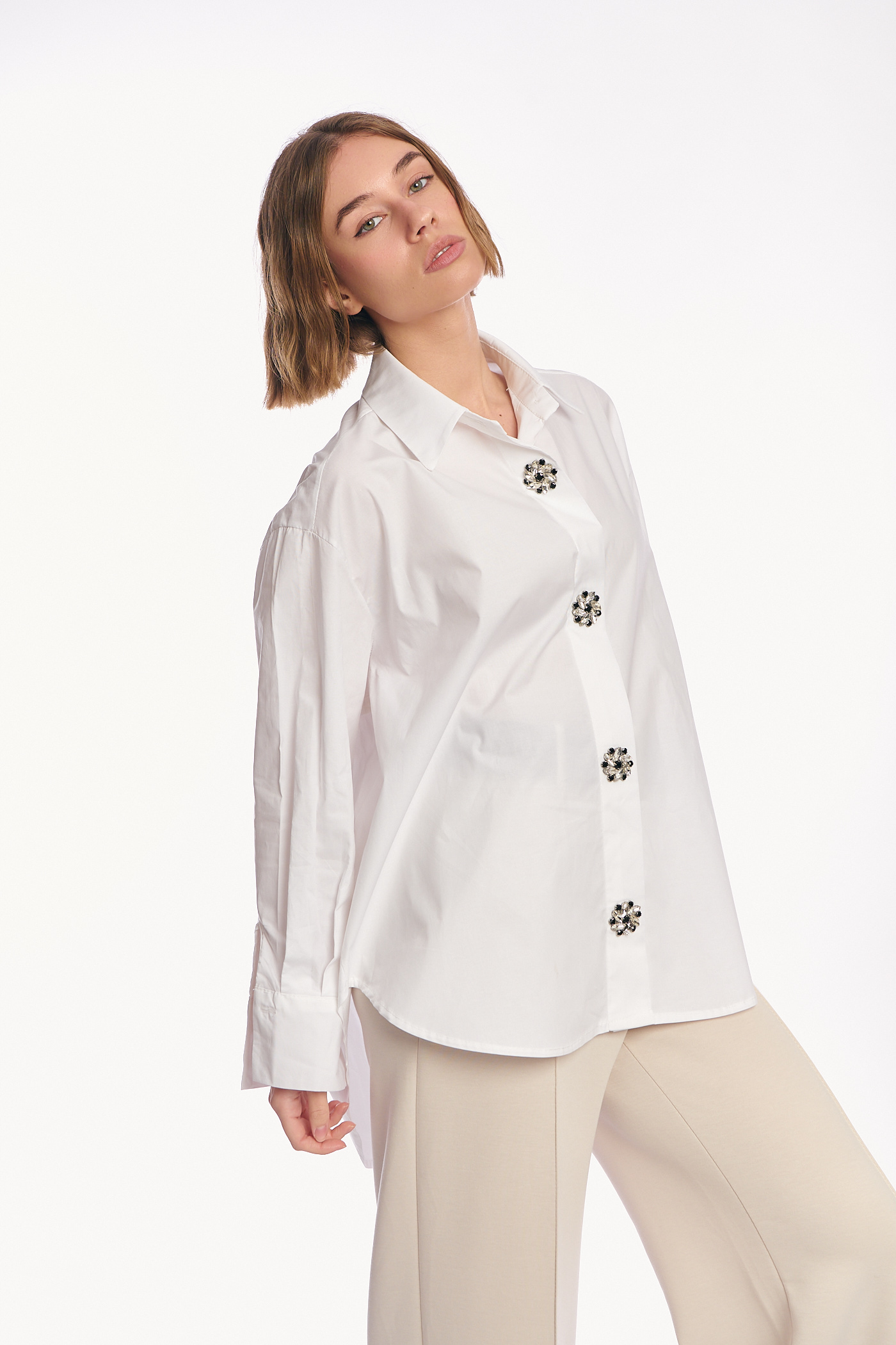 Ένα διαχρονικό κομμάτι που επαναπροσδιορίζεται μέσα από glam λεπτομέρειες. Αυτό το oversized πουκάμισο αποτελεί τη βάση για αμέτρητους συνδυασμούς, από το γραφείο μέχρι τη βραδινή έξοδο, χάρη στα μεγάλα διακοσμητικά κουμπιά σε σχήμα λουλουδιού που είναι στολισμένα με λαμπερές πέτρες και κρύσταλλα.