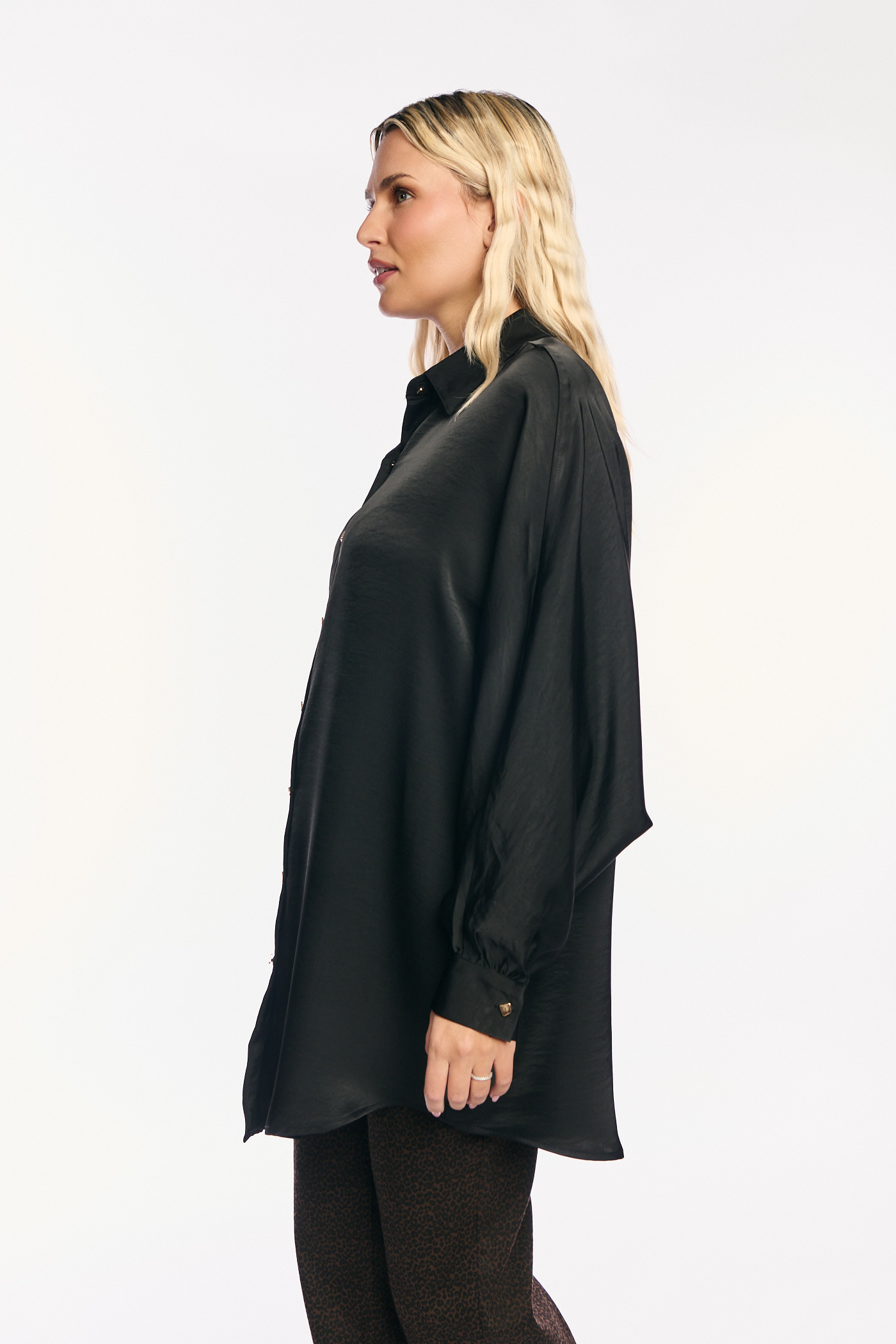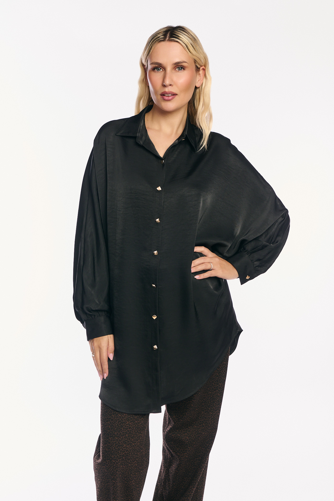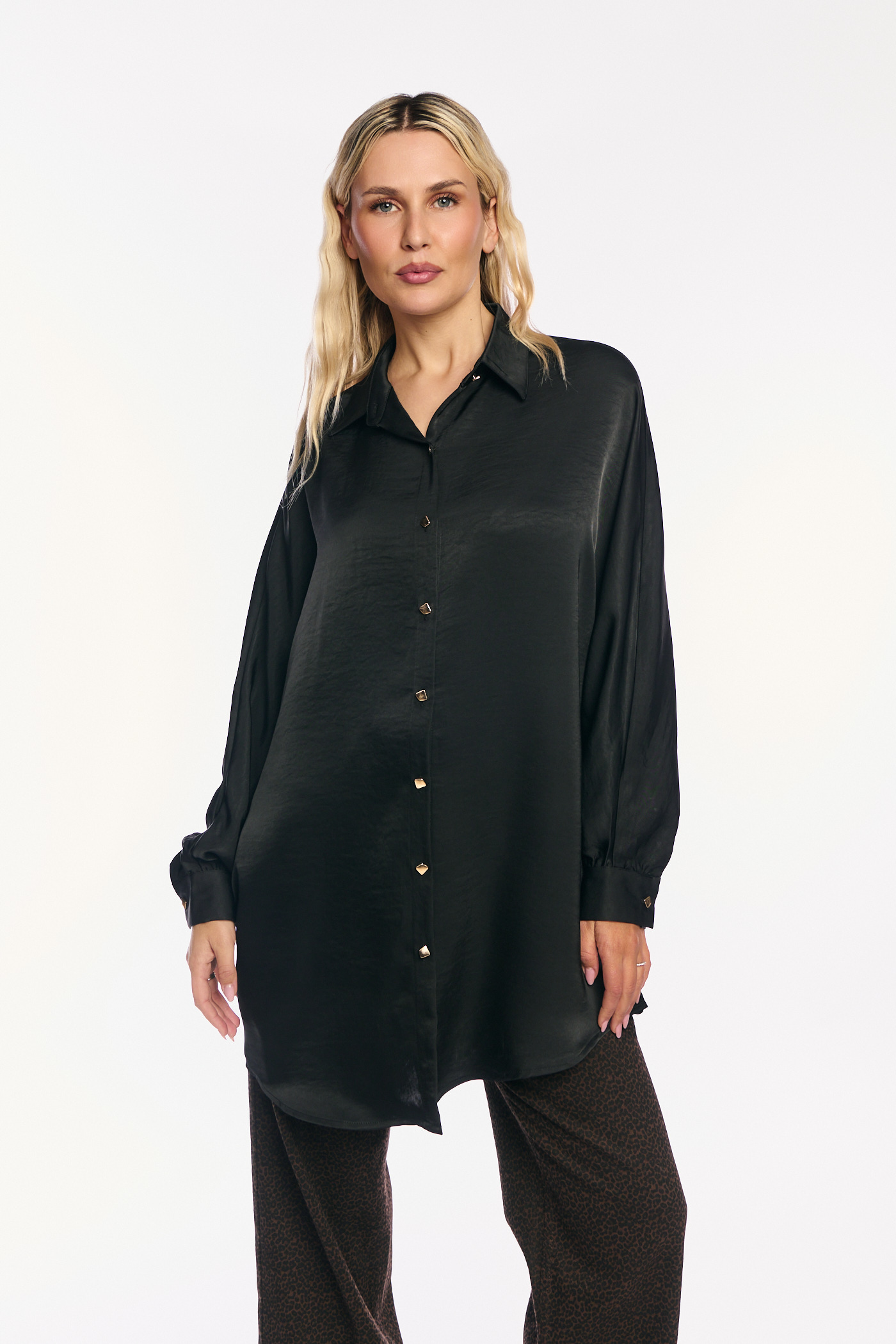 Πρόκειται για μία κομψή και ευέλικτη πουκαμίσα από σατέν ύφασμα σε κλασικό μαύρο χρώμα. Διαθέτει χαλαρή, oversized γραμμή και μακρύ μήκος, που φτάνει στο ύψος των μηρών. Έχει κλασικό γιακά, μακριά μανίκια με μανσέτες και κλείνει μπροστά με μεγάλα, διακοσμητικά κουμπιά σε χρυσό χρώμα. Το τελείωμα είναι στρογγυλό.