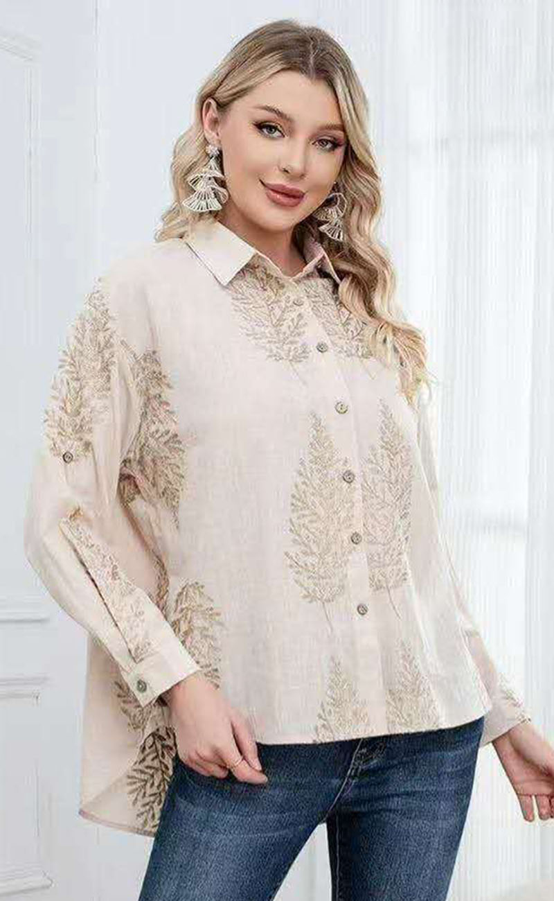 Μπεζ Λινό Πουκάμισο με Ανάγλυφα Floral Κεντήματα και Ασύμμετρο Τελείωμα-DJ189