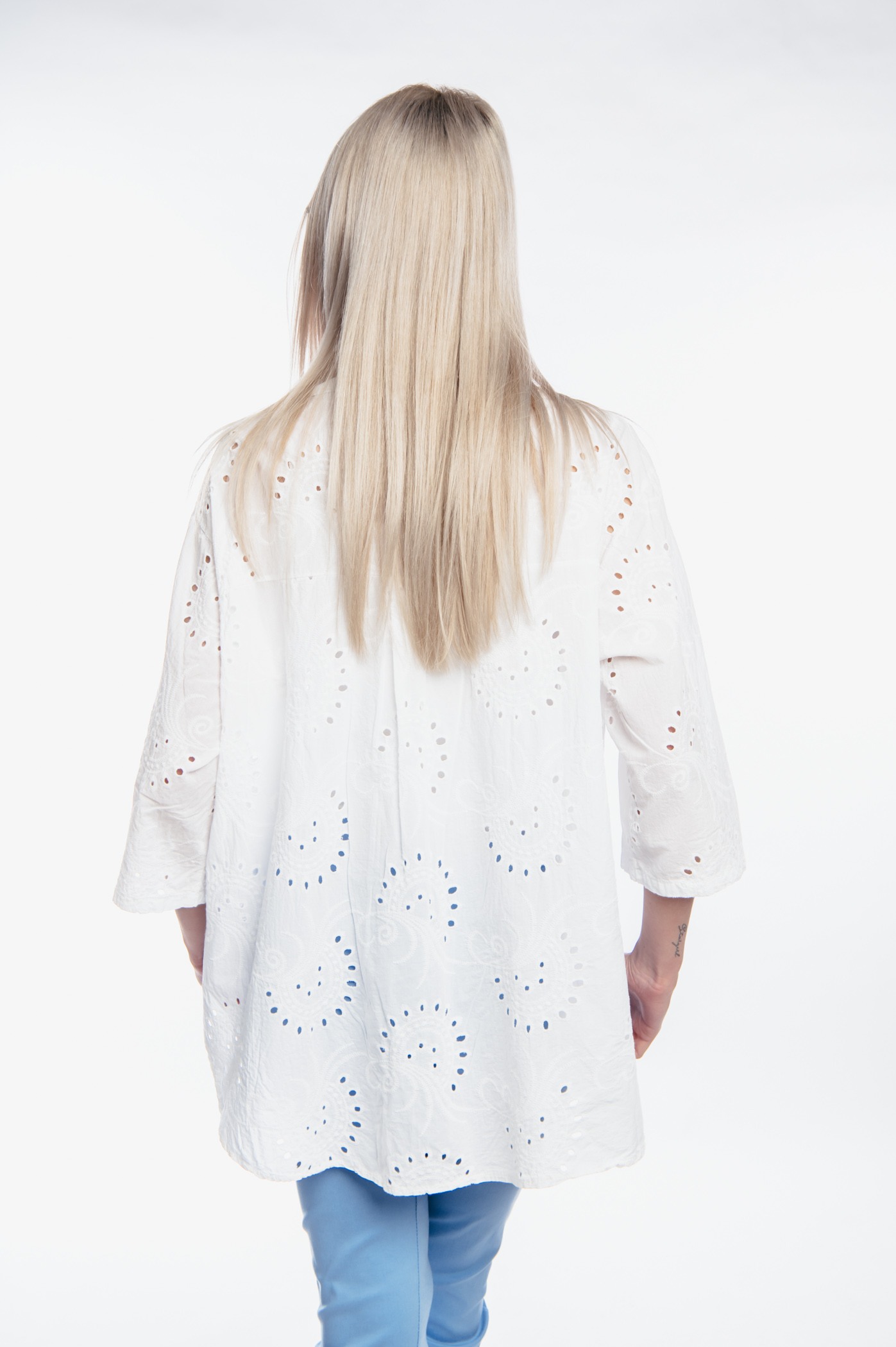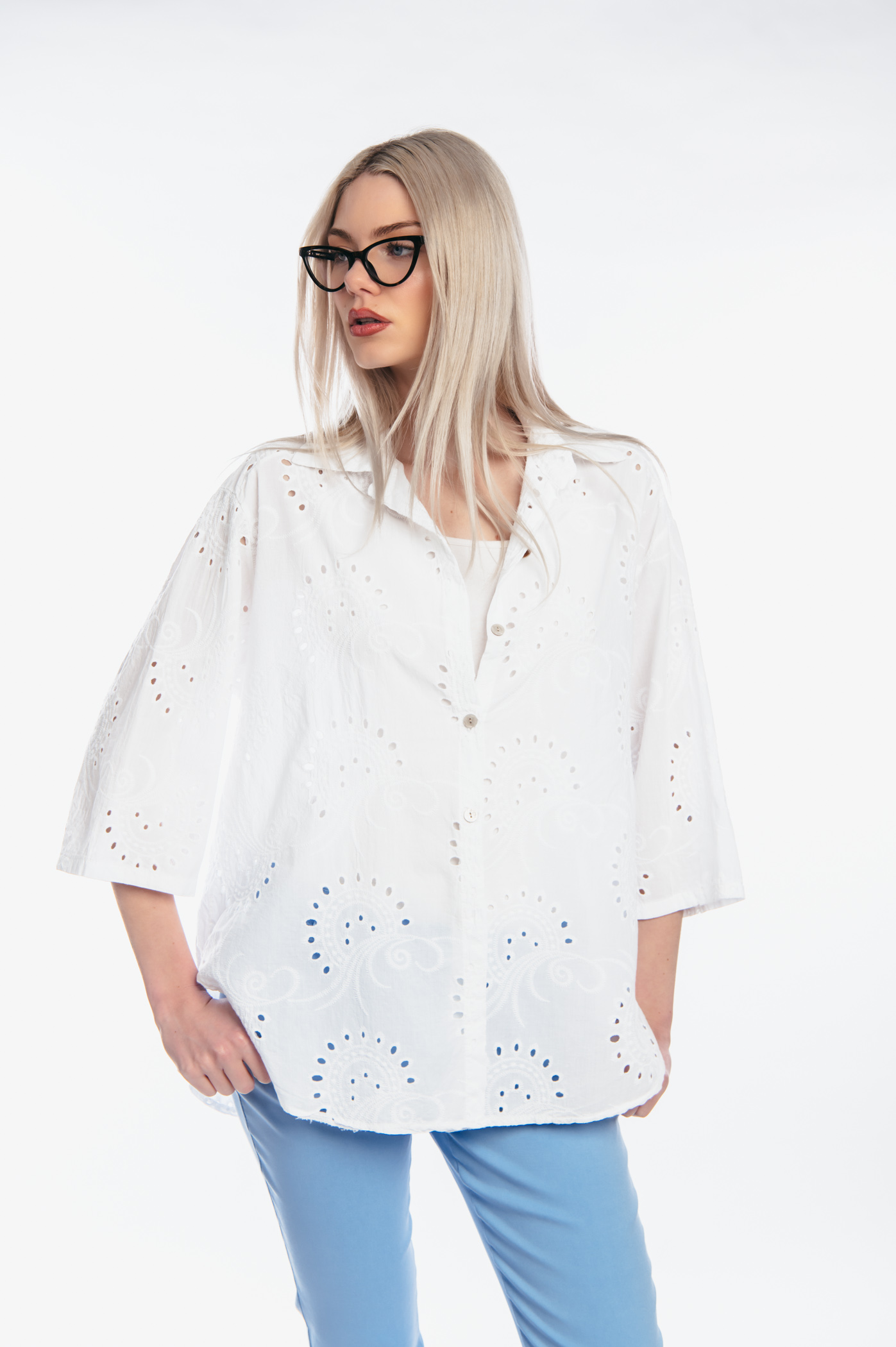Πουκάμισο ασύμμετρο με 3/4 μανίκι τύπου κιπούρ και κουμπιά στο μπροστά μέρος.