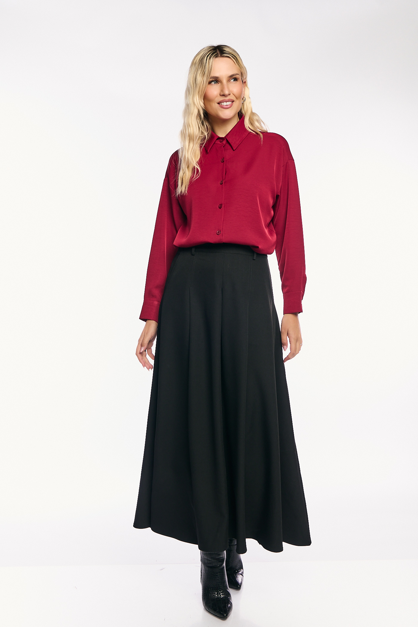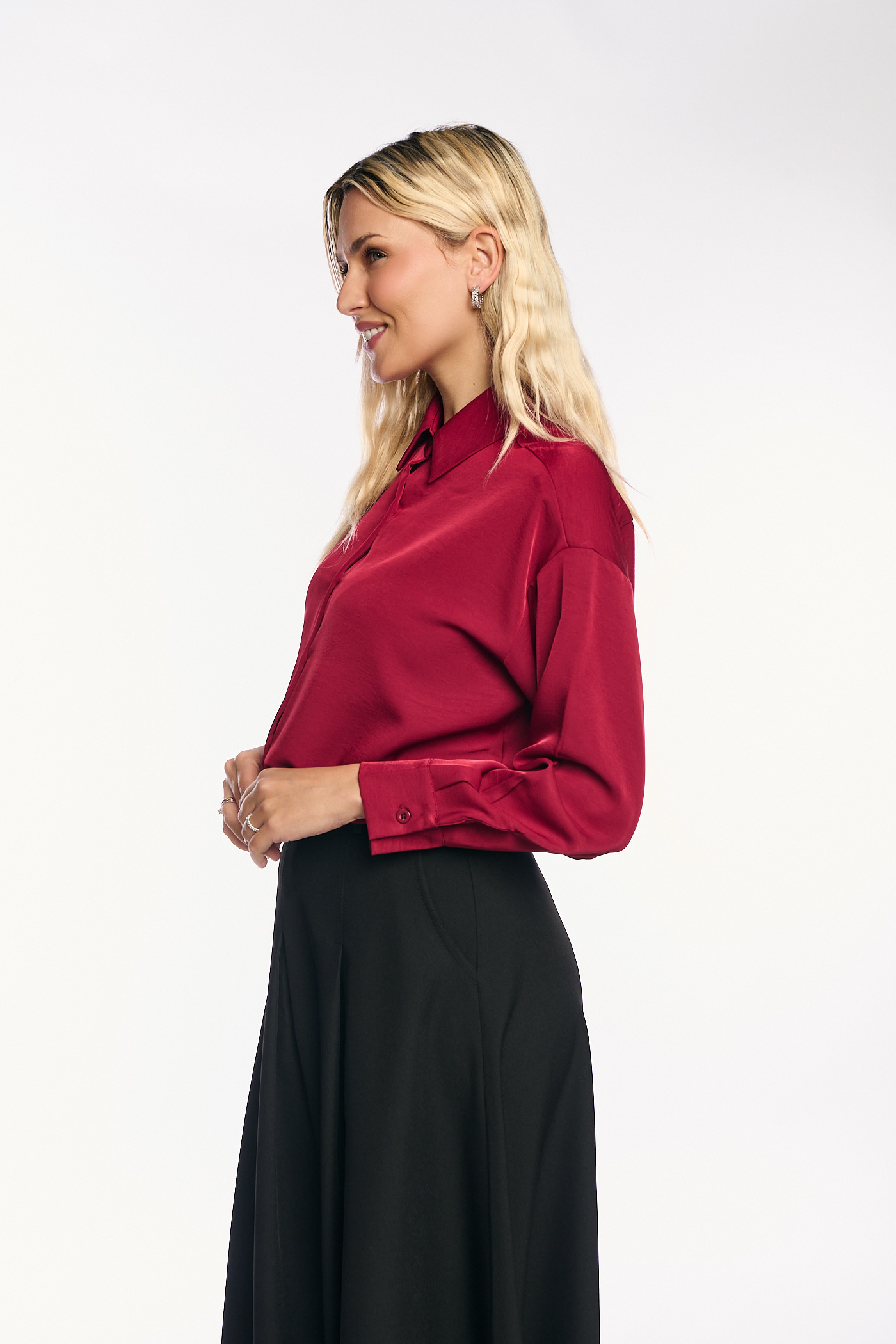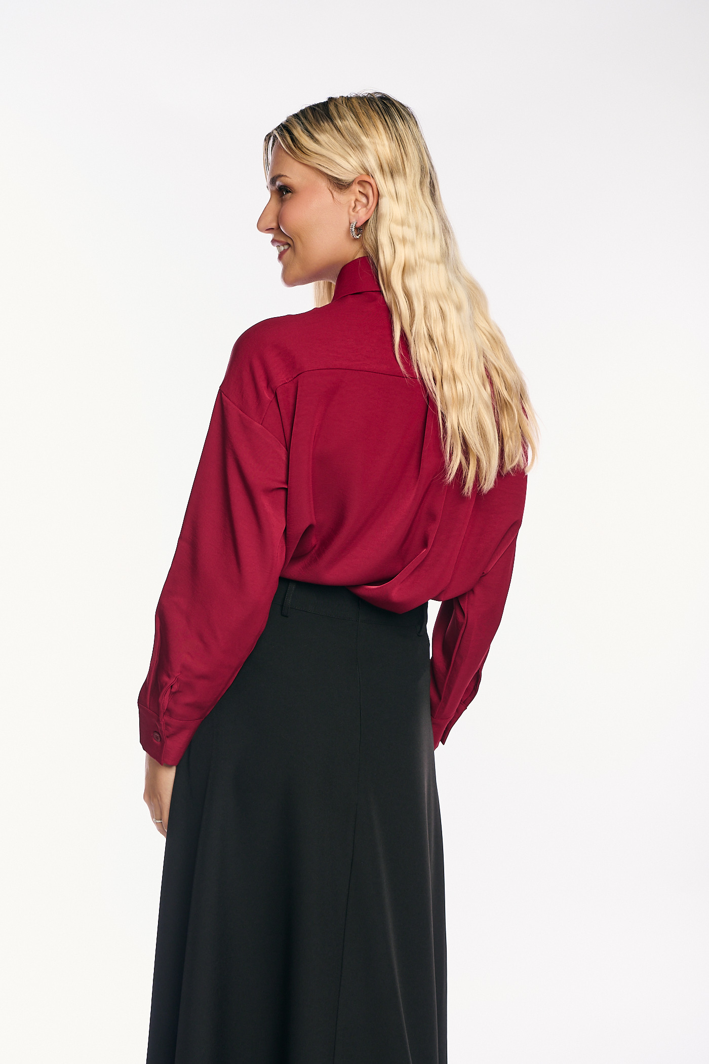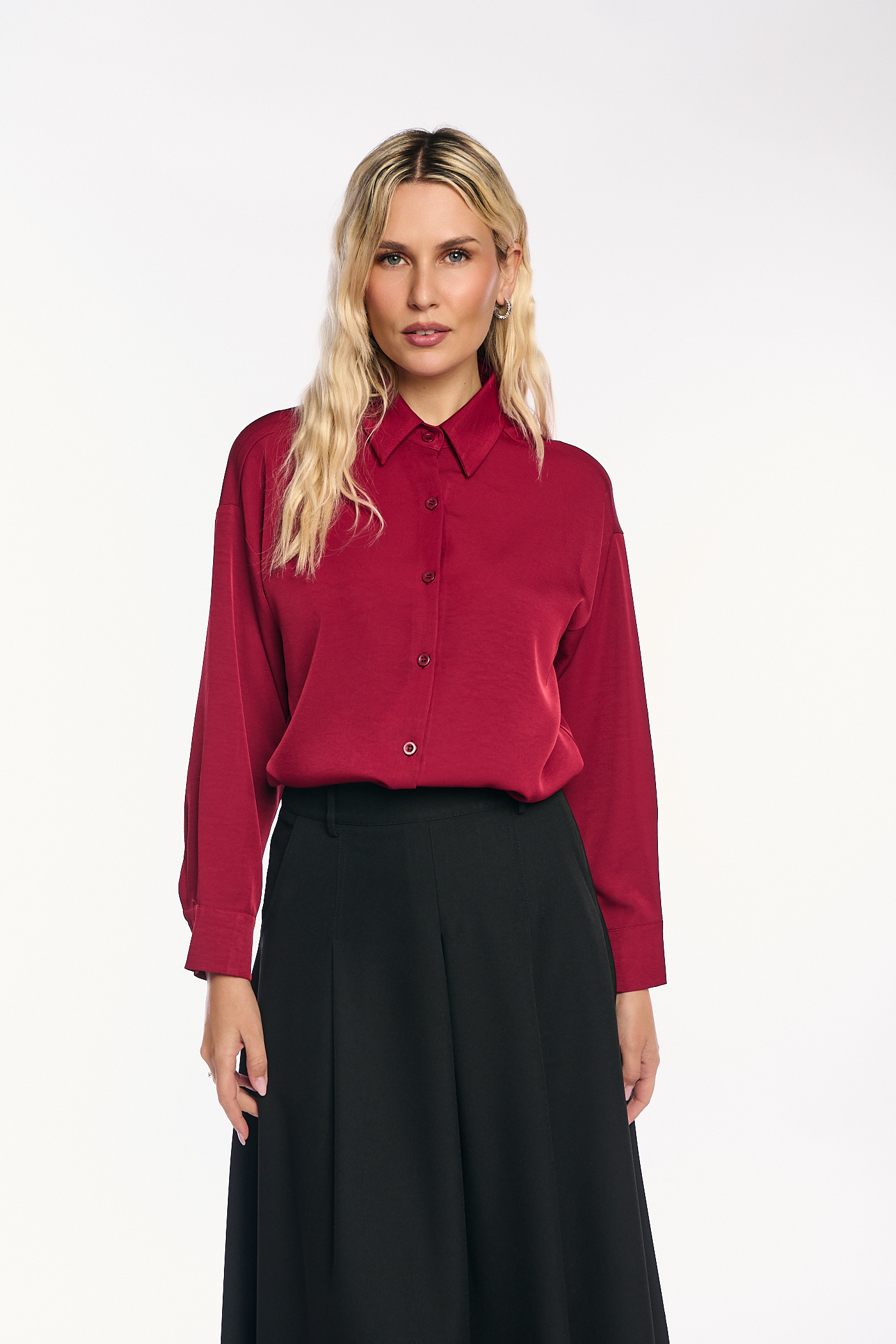 Πρόκειται για ένα κομψό και ευκολοφόρετο πουκάμισο από σατέν ύφασμα σε πλούσιο κόκκινο χρώμα. Έχει κλασικό γιακά και κλείνει με κουμπιά. Το ρούχο διαθέτει άνετη, χαλαρή γραμμή, μακριά μανίκια με σούρες στους ώμους και μανσέτες με κουμπιά. Το τελείωμα είναι στρογγυλό με μικρά πλαϊνά σκισίματα, καθιστώντας το ιδανικό για να φορεθεί είτε μέσα από παντελόνια και φούστες είτε απέξω.