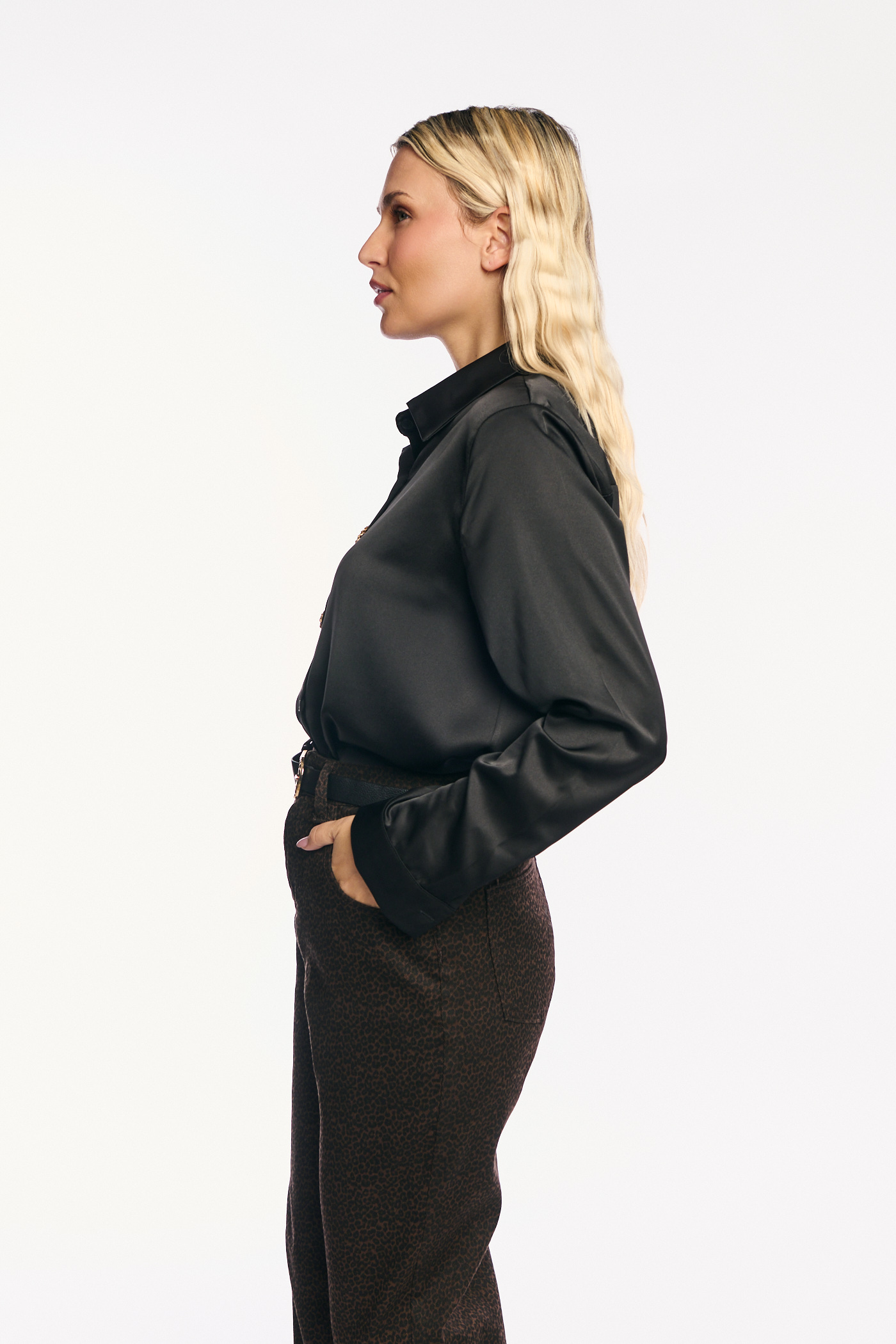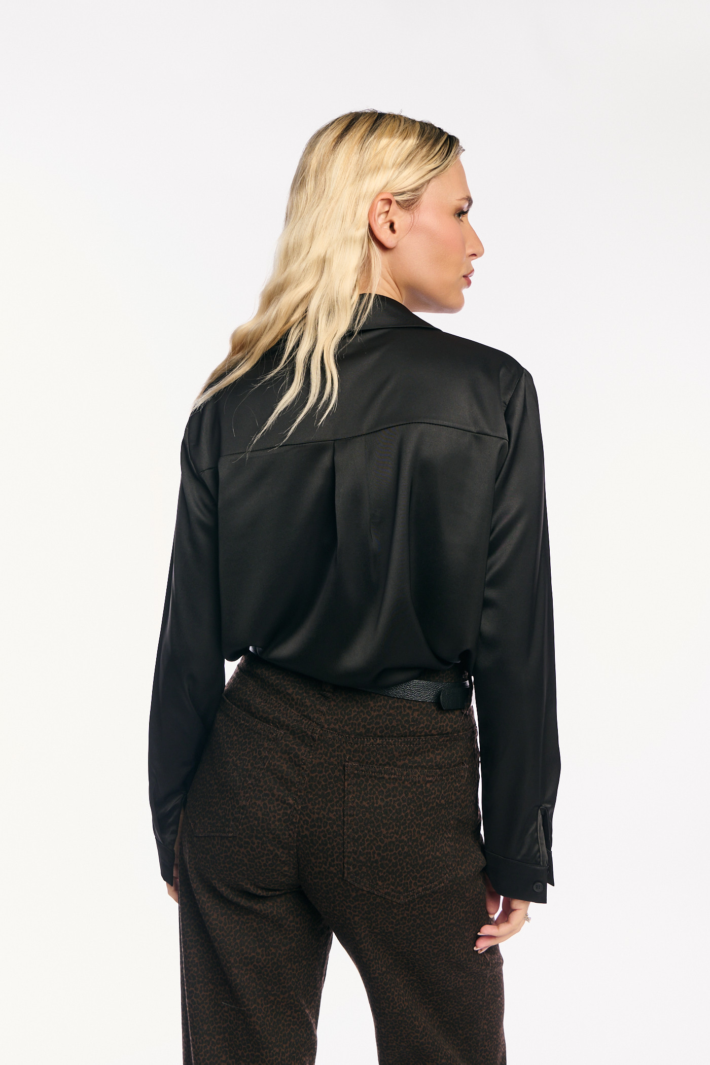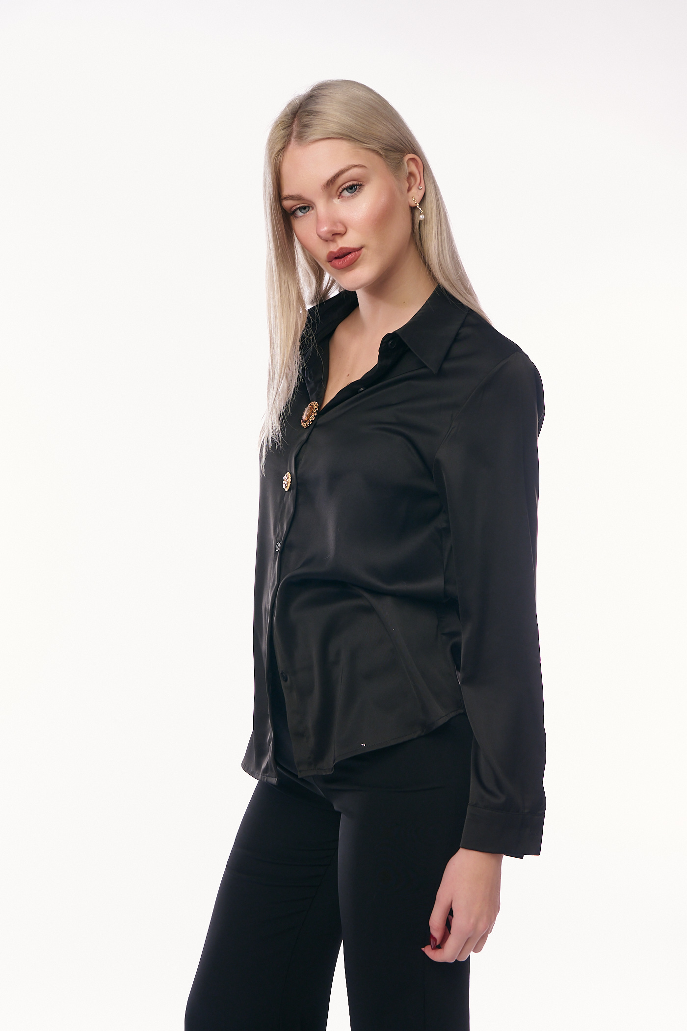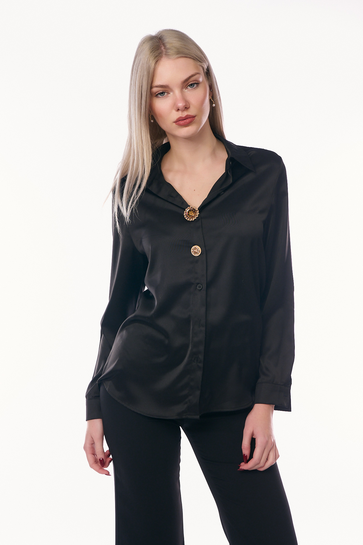 Πρόκειται για ένα κομψό και πολυτελές πουκάμισο από σατέν ύφασμα σε κλασικό μαύρο χρώμα. Διαθέτει κλασικό γιακά και μακριά μανίκια με μανσέτες. Το ρούχο κλείνει μπροστά με σειρές κουμπιών, όπου τα δύο κεντρικά κουμπιά είναι μεγάλα, στρογγυλά και λειτουργούν ως βασικό διακοσμητικό στοιχείο. Τα διακοσμητικά κουμπιά είναι περίτεχνα, στολισμένα με λαμπερά στρας σε χρυσές και καφέ αποχρώσεις, προσδίδοντας μια πολυτελή αίσθηση.