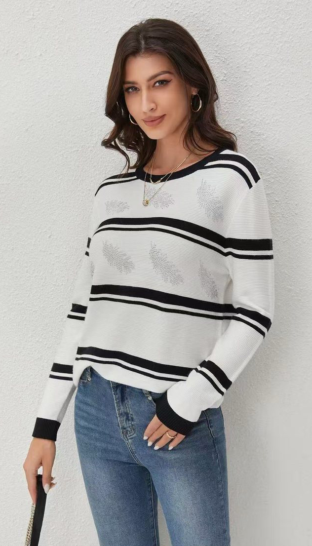 Πουλόβερ με ριγέ σχέδιο σε μαύρο και λευκό χρώμα με στρογγυλή λαιμόκοψη και κανονική, άνετη γραμμή. Ξεχωρίζουν οι δύο λευκές ρίγες στο κέντρο, οι οποίες έχουν διακοσμητικά, αστραφτερά κεντήματα σε σχήμα φύλλου. Οι μανσέτες και το τελείωμα είναι σε ριμπ ύφανση και μαύρο χρώμα.
