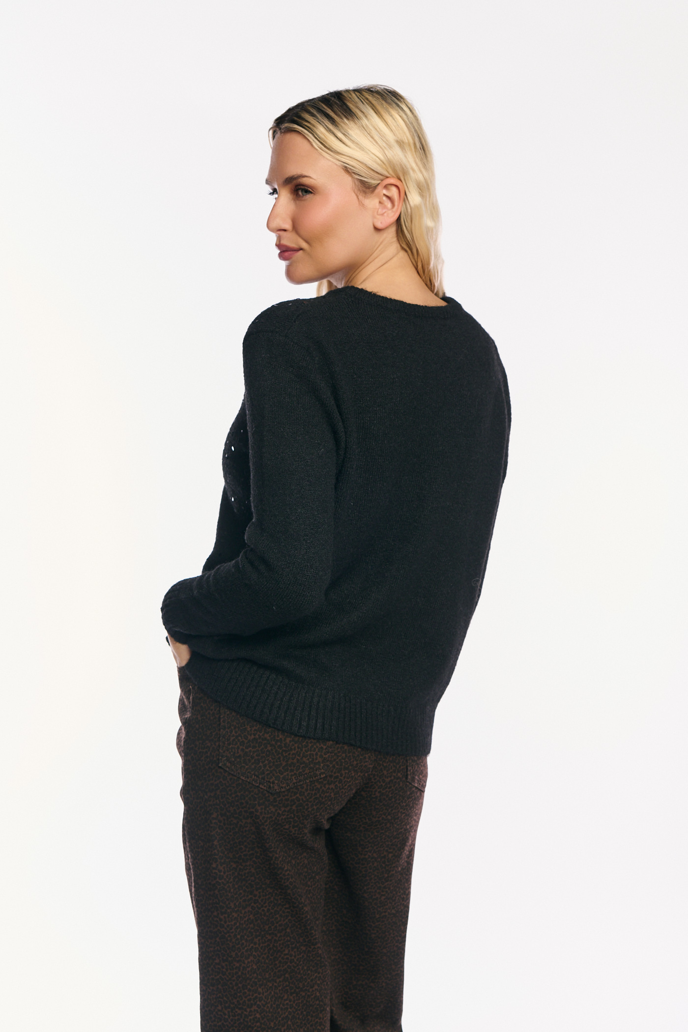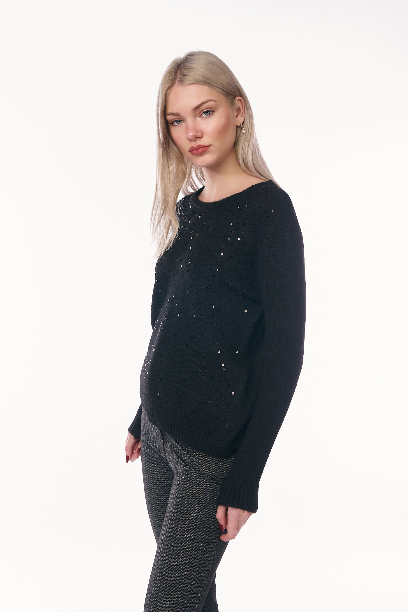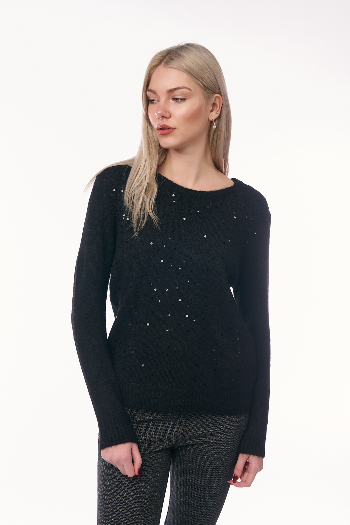 Πουλόβερ Crew Neck με Οversized Παγιέτες στους Ώμους Μαύρο-QF9596G