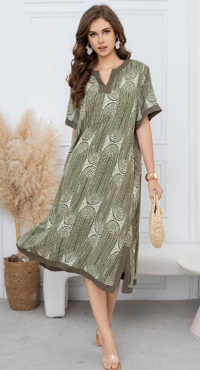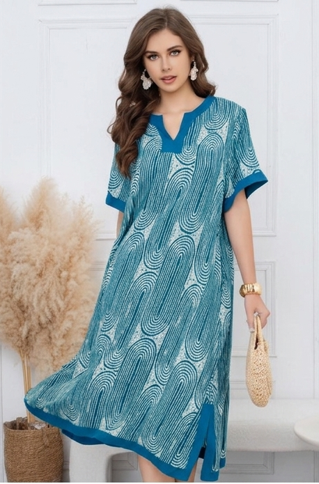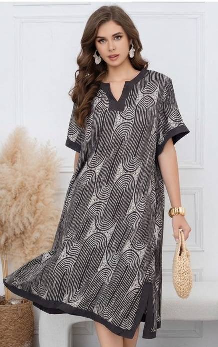 Αυτό το αέρινο midi φόρεμα αποτελεί την επιτομή του κομψού ethnic στυλ, προσφέροντας μια άνετη και ταυτόχρονα σοφιστικέ επιλογή για τις καλοκαιρινές σας εμφανίσεις. Το ρούχο διακρίνεται για το περίτεχνο μοτίβο του με επαναλαμβανόμενες καμπύλες γραμμές πάνω σε λευκό φόντο, δημιουργώντας ένα οπτικά εντυπωσιακό και αρμονικό αποτέλεσμα.