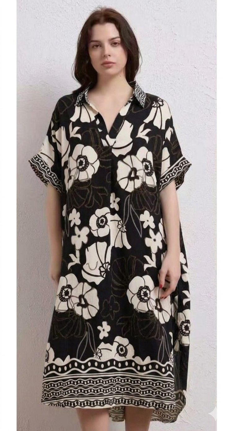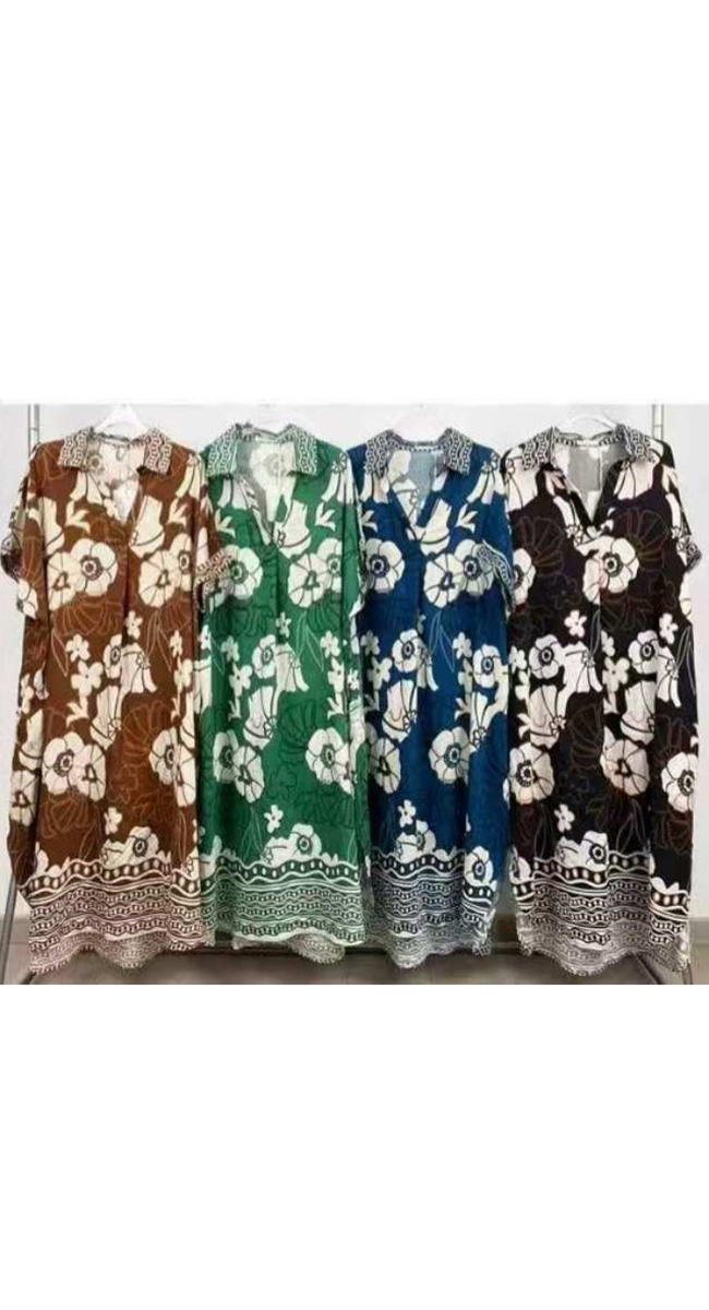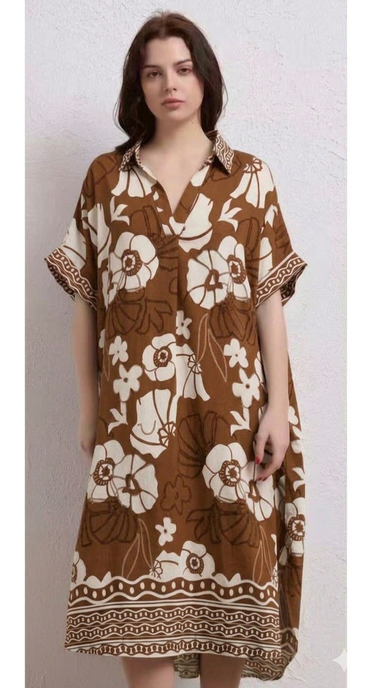 Αυτό το καφτάνι-φόρεμα αποτελεί μια ιδανική επιλογή για άνετες και κομψές εμφανίσεις με boho επιρροές. Το ρούχο διακρίνεται για την πλούσια καφέ ή μαύρη ή πράσινη ή μπλε απόχρωσή του, η οποία κοσμείται από ένα μεγάλο, εντυπωσιακό φλοράλ μοτίβο σε κρεμ τόνους που καλύπτει όλη την επιφάνεια.
