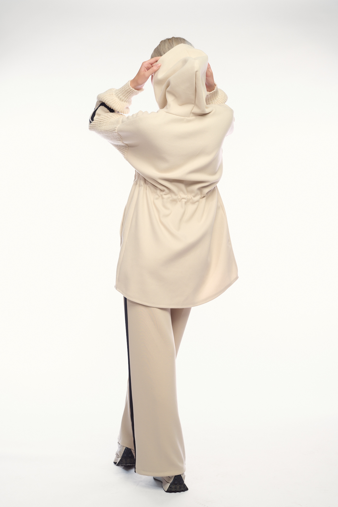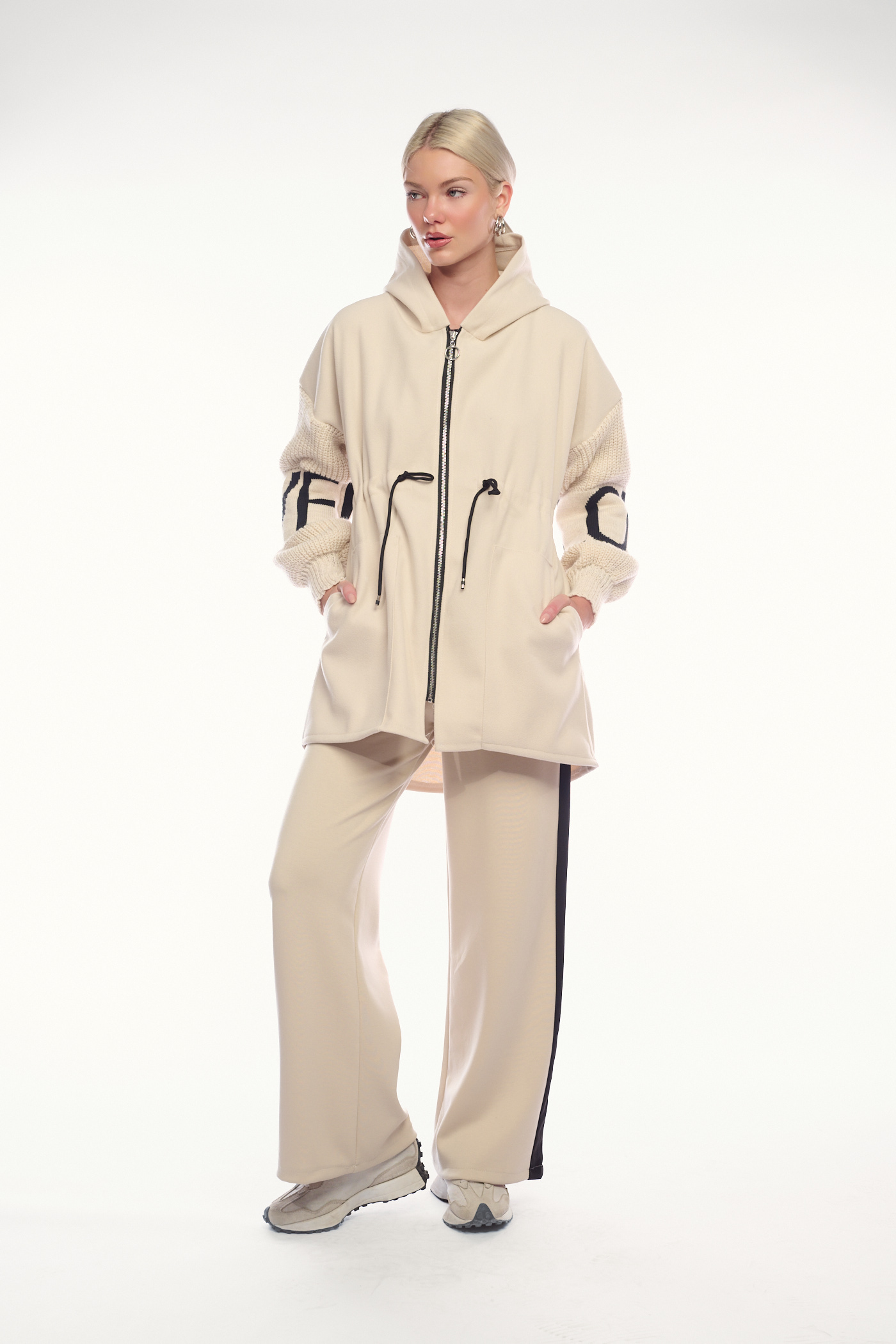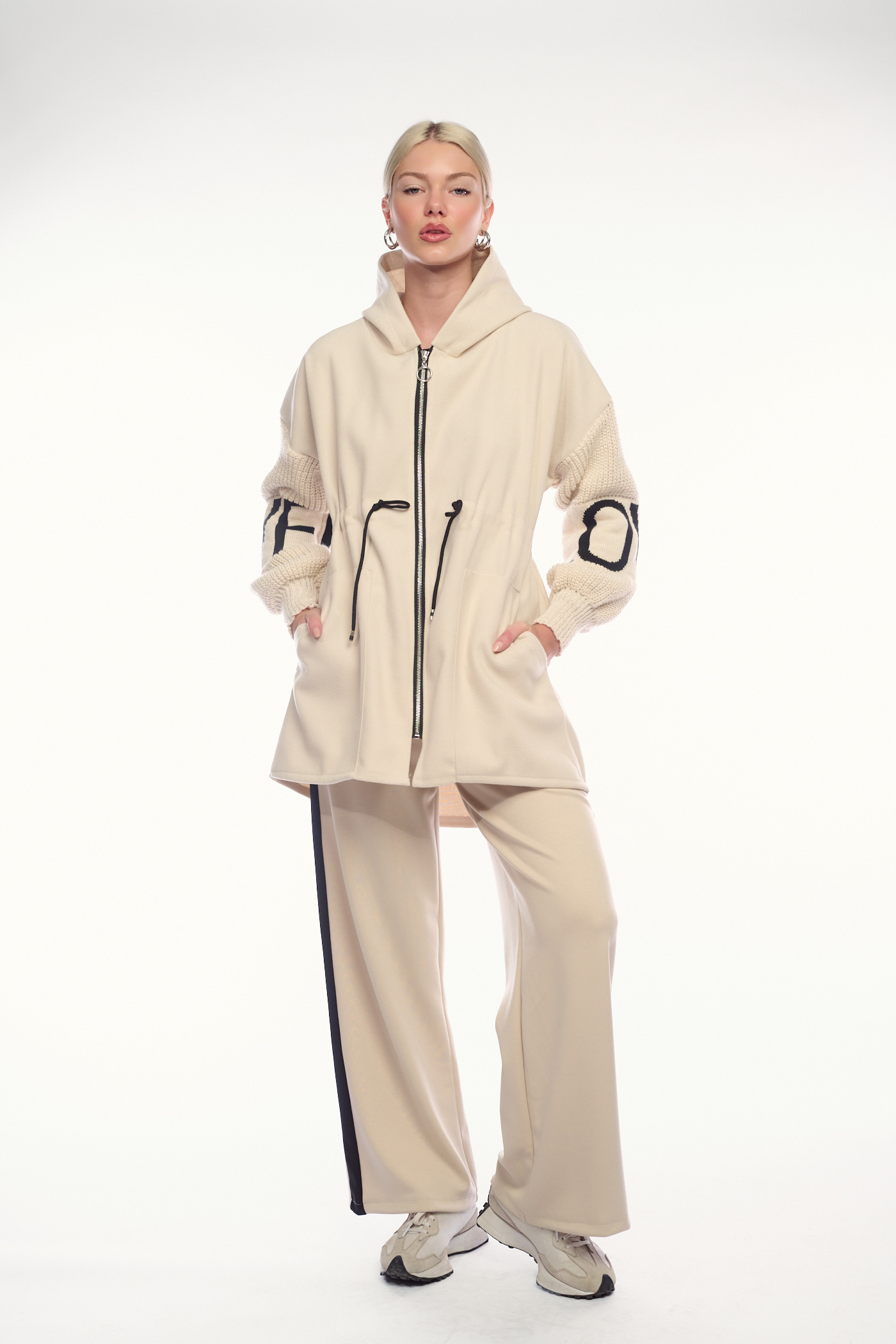 Πρόκειται για μια μοντέρνα και άνετη ζακέτα με φερμουάρ σε εκρού απόχρωση. Το ρούχο διαθέτει κουκούλα, πλεκτές λεπτομέρειες στα μανίκια και ένα κορδόνι στη μέση για προσαρμογή. Στα μανίκια, έχει επίσης διακοσμητικές σκούρες ρίγες ή γράμματα, που προσδίδουν μια σπορ και μοντέρνα πινελιά.