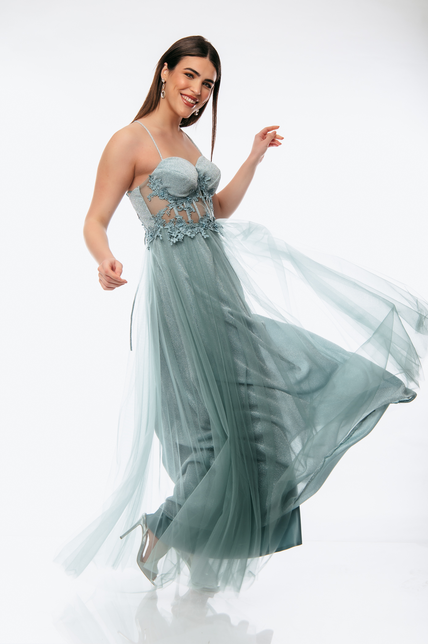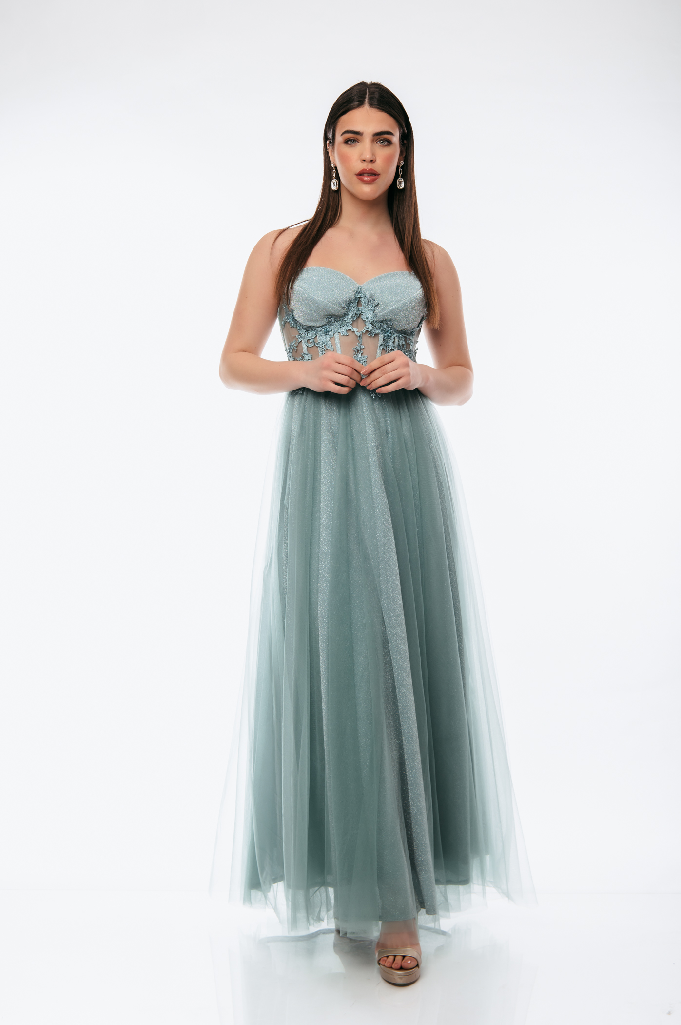 Φόρεμα αμπιγιέ με τούλι και glitter,διαφάνεια και διακοσμητικά κεντήματα με πέρλες στο πάνω μέρος και κορδόνια για δέσιμο στο πίσω.