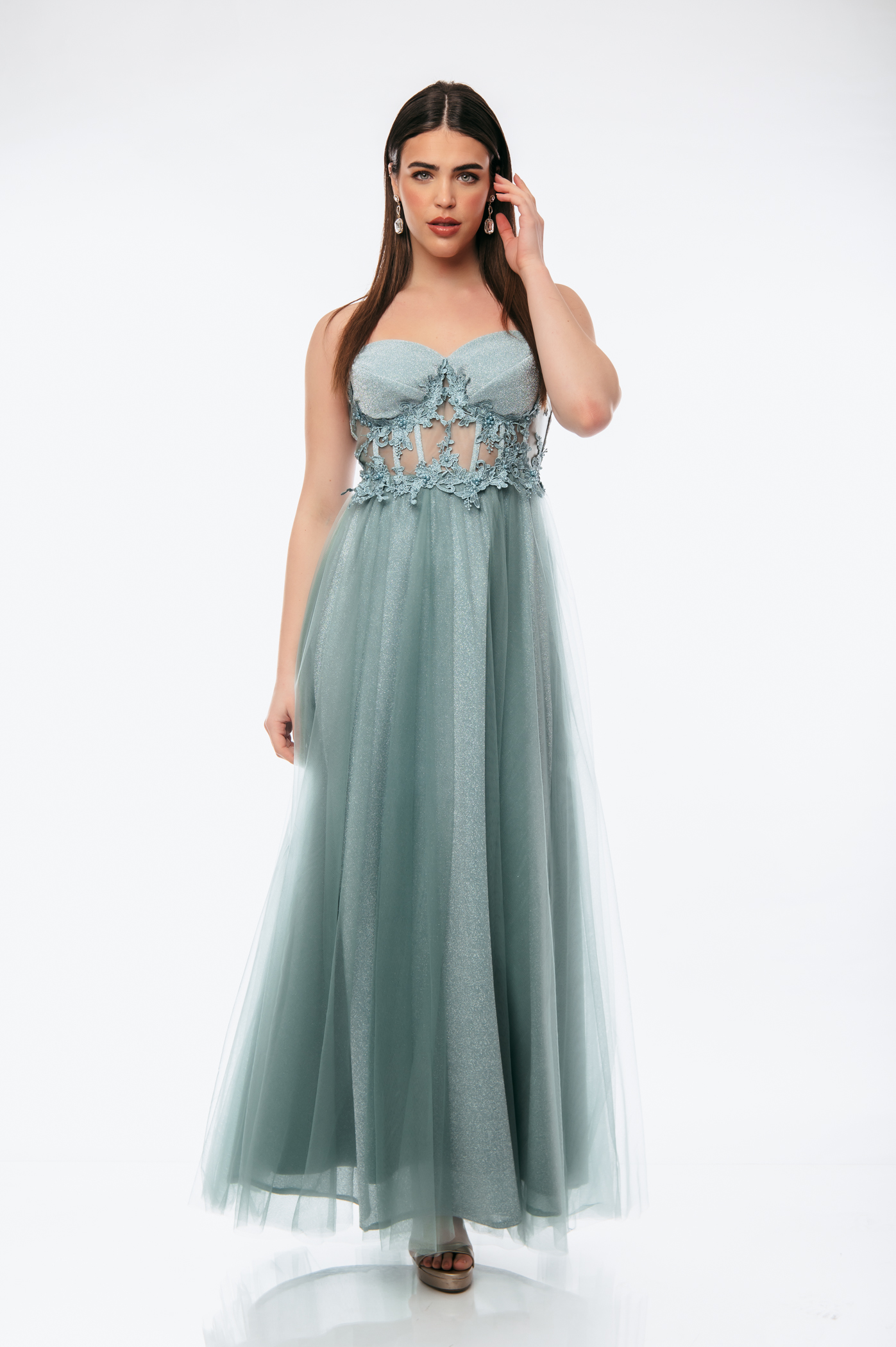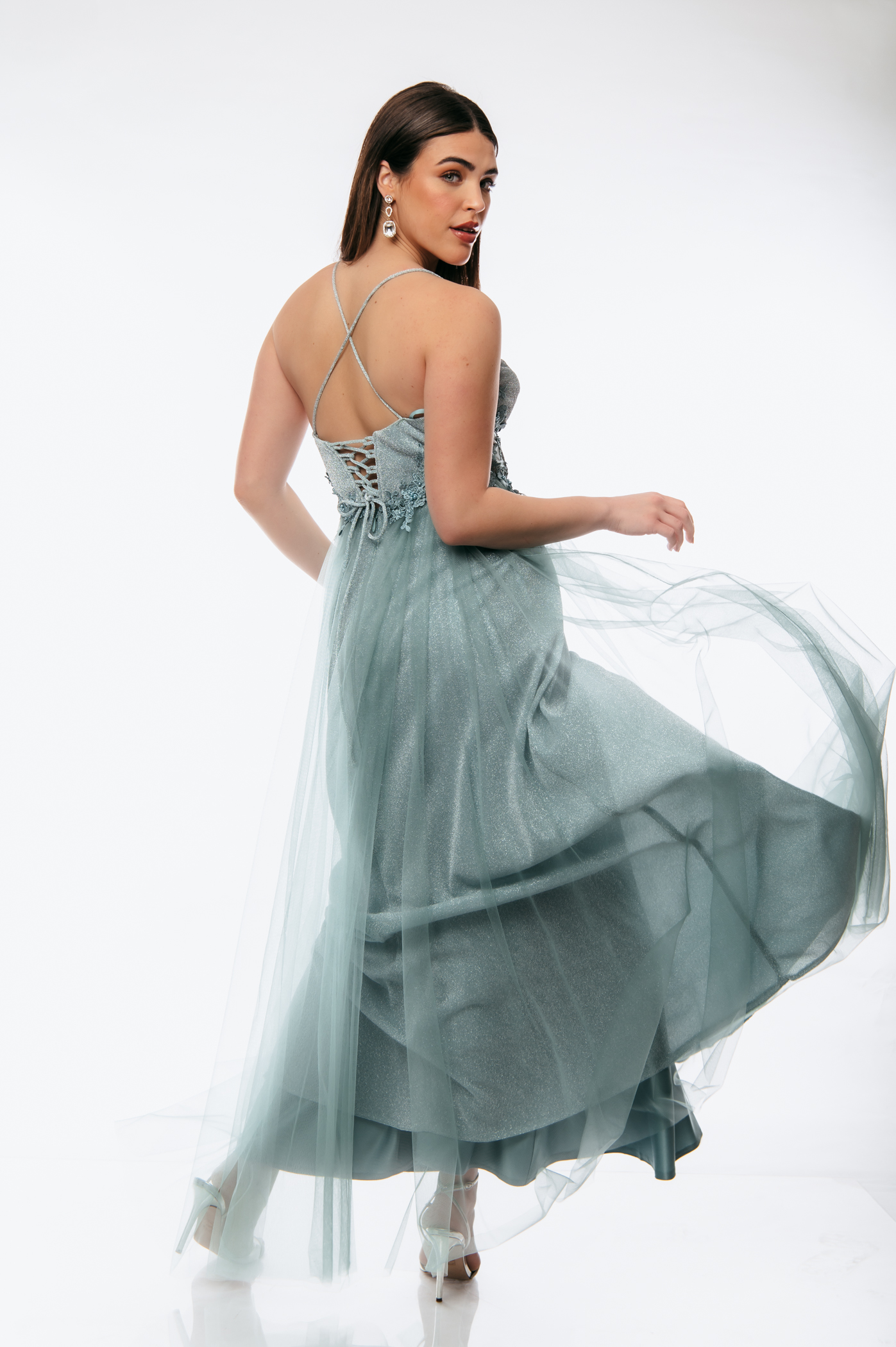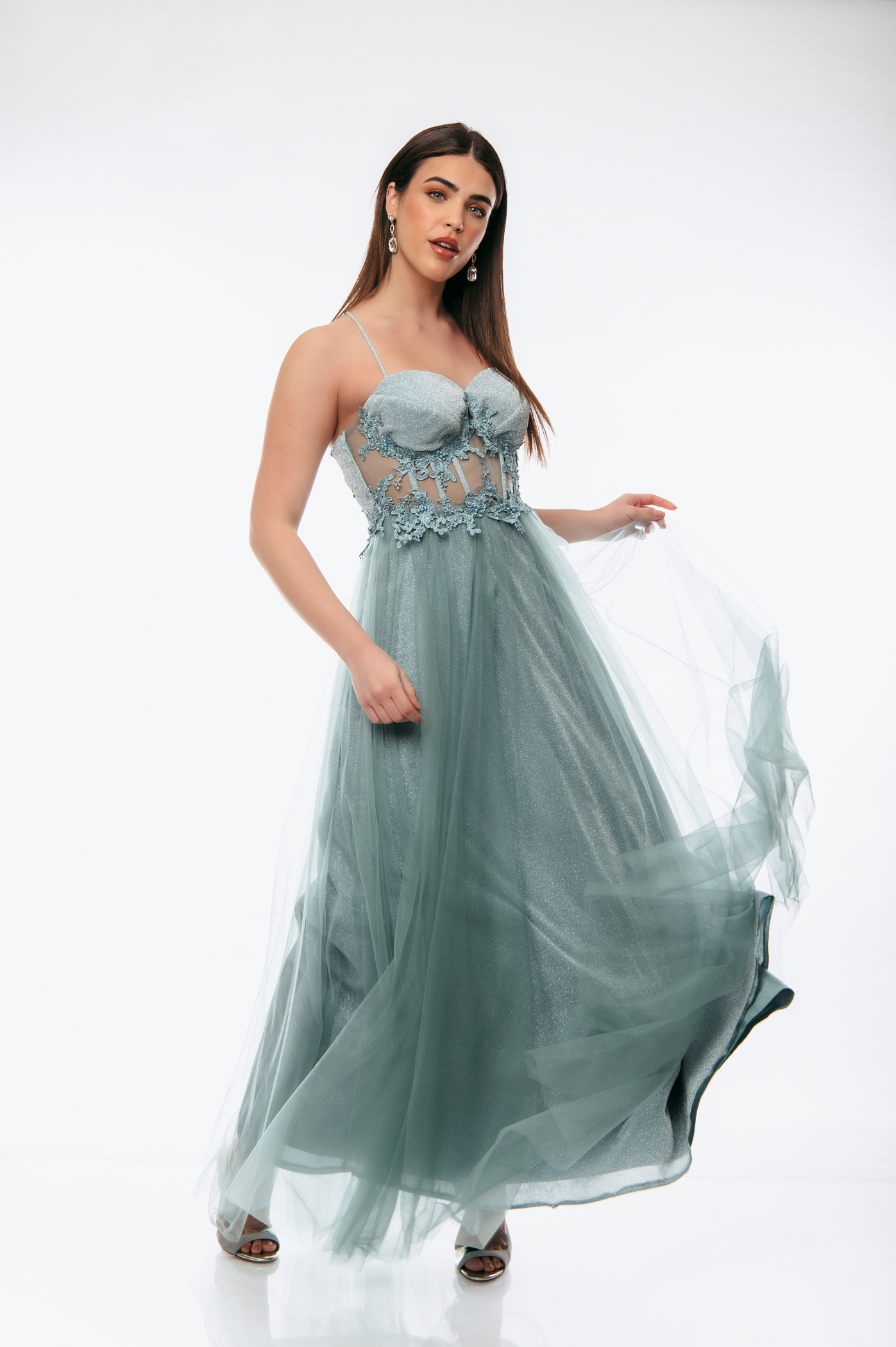 Φόρεμα αμπιγιέ με τούλι και glitter,διαφάνεια και διακοσμητικά κεντήματα με πέρλες στο πάνω μέρος και κορδόνια για δέσιμο στο πίσω.