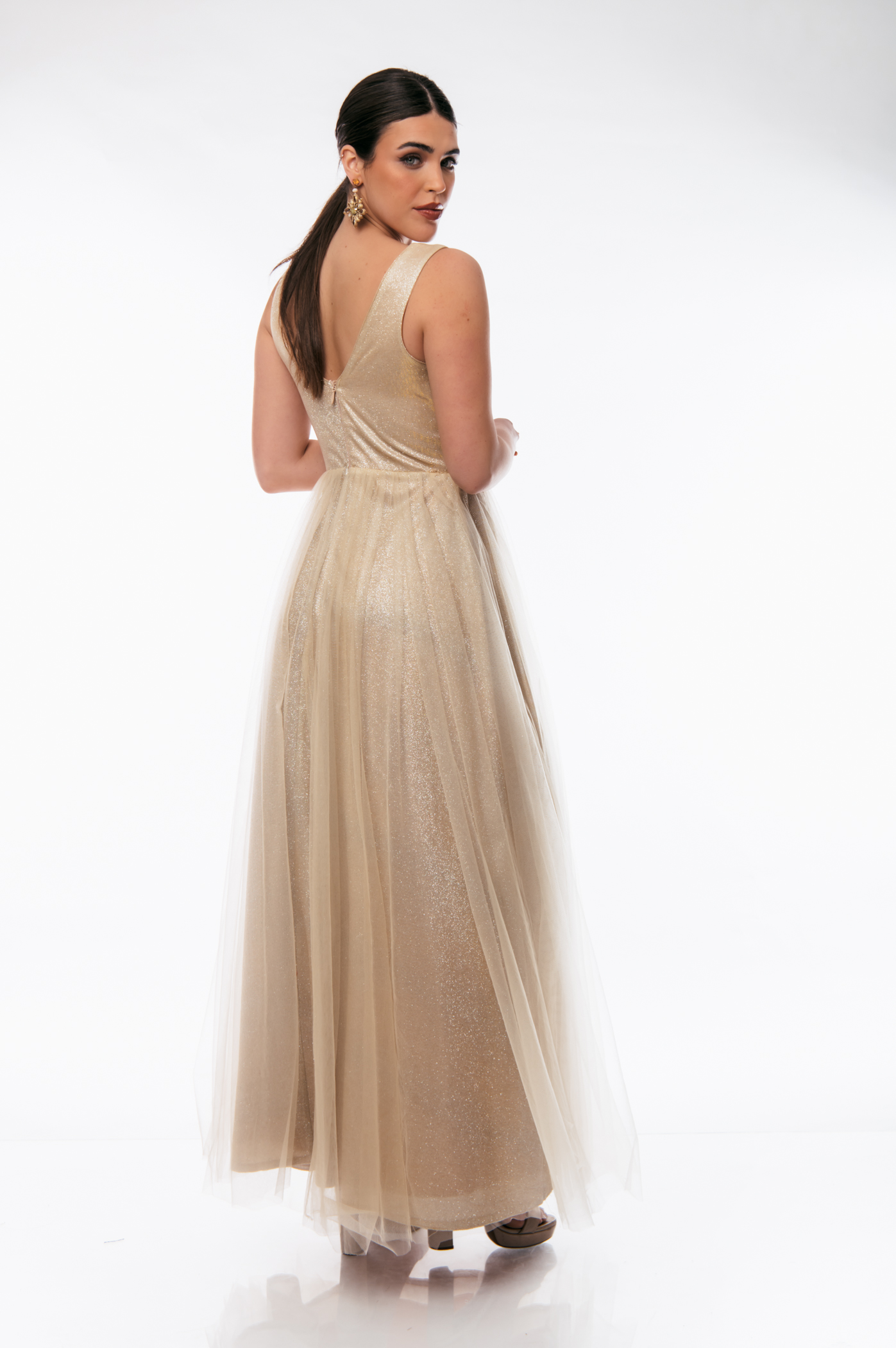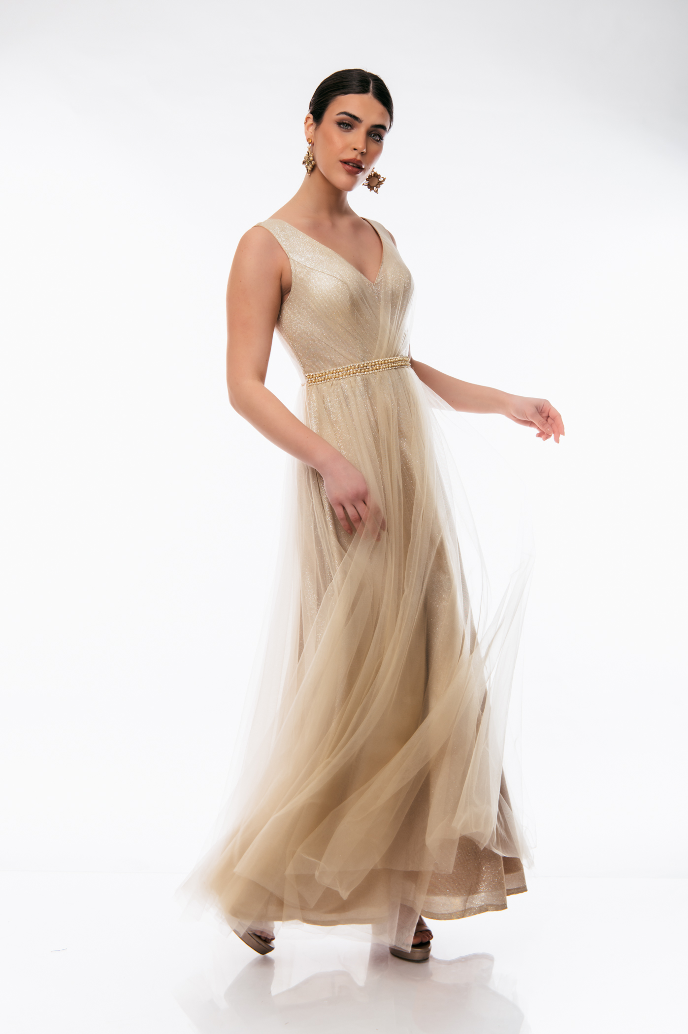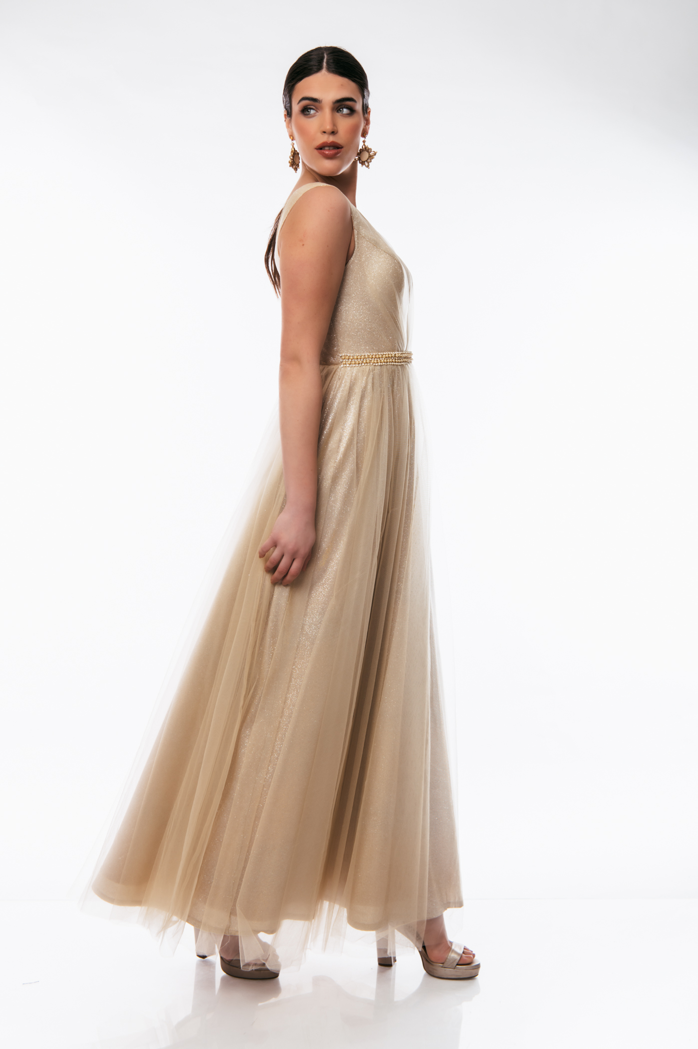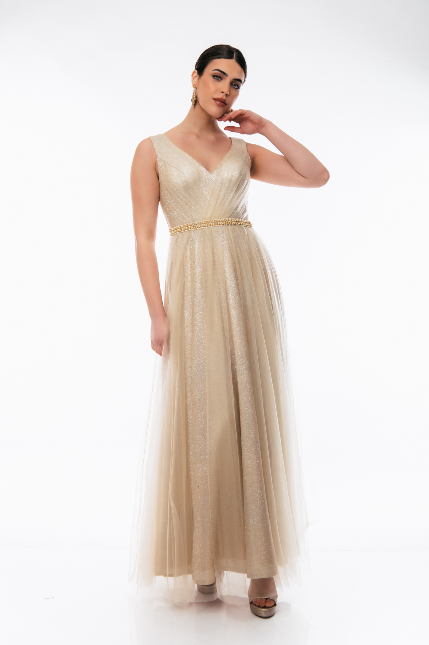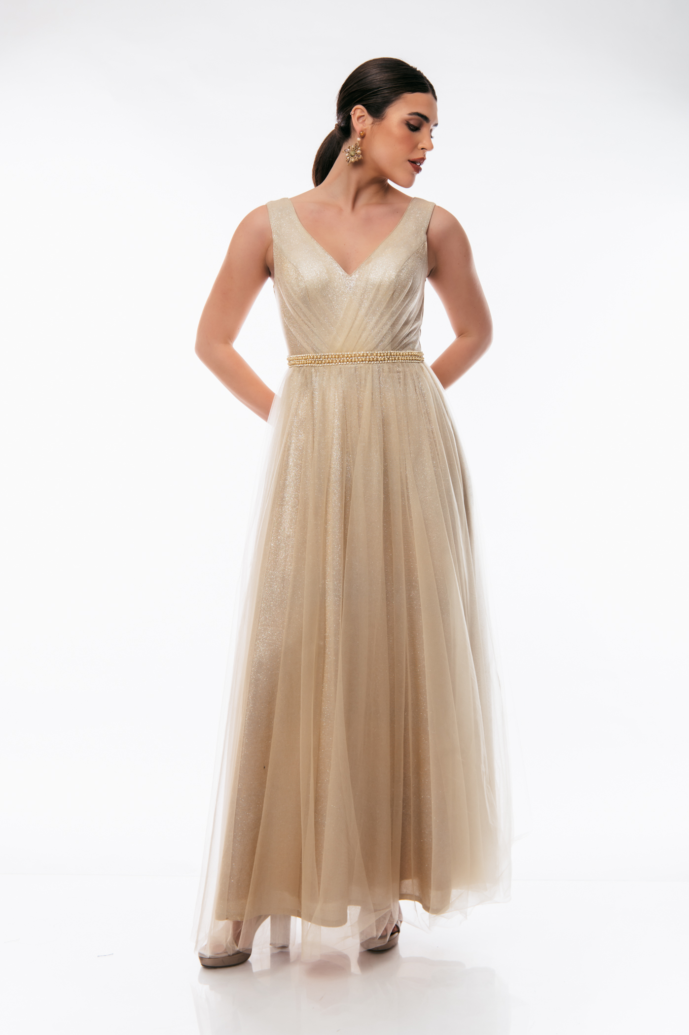 Φόρεμα αμπιγιέ με ve τούλι και glitter,διακοσμητικές πέρλες στην μέση και φερμουάρ στο πίσω μέρος.