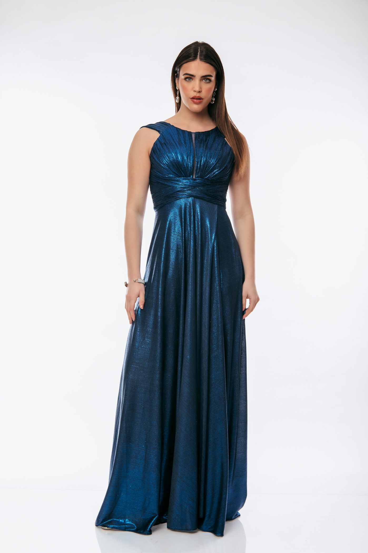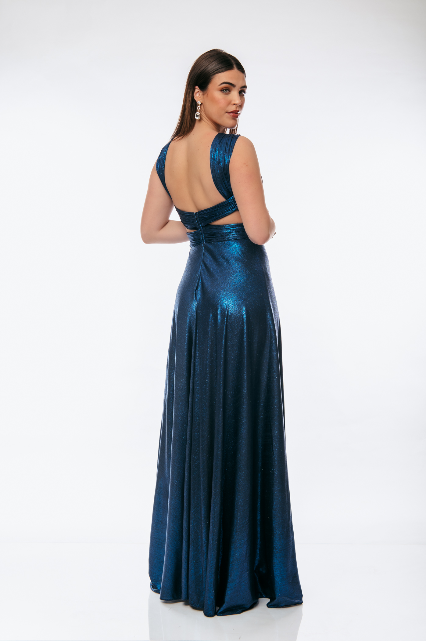 Φόρεμα αμπιγιέ μεταλιζέ εξώπλατο σε γραμμή αμπίρ με φερμουάρ στο πίσω μέρος και πλισέ δεσίματα στο πάνω.
