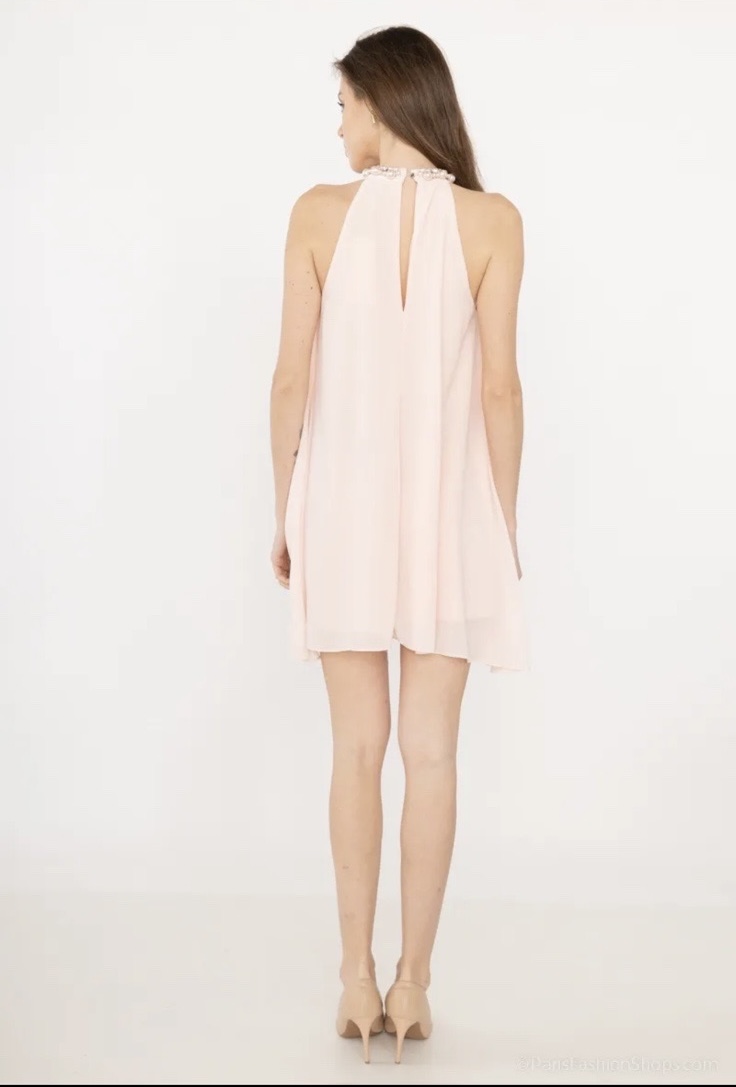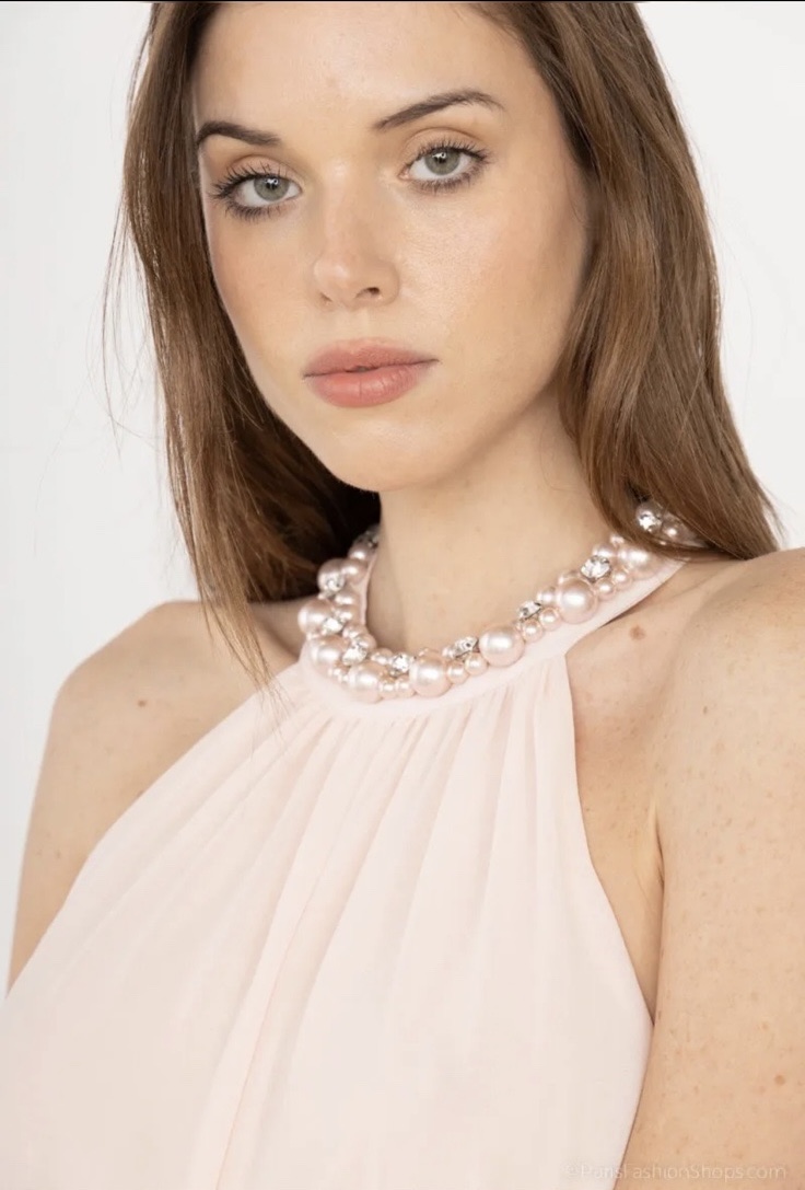 Φόρεμα αμπιγιέ κοντό μουσελίνα με πέρλες στον λαιμό σε ίσια γραμμή.