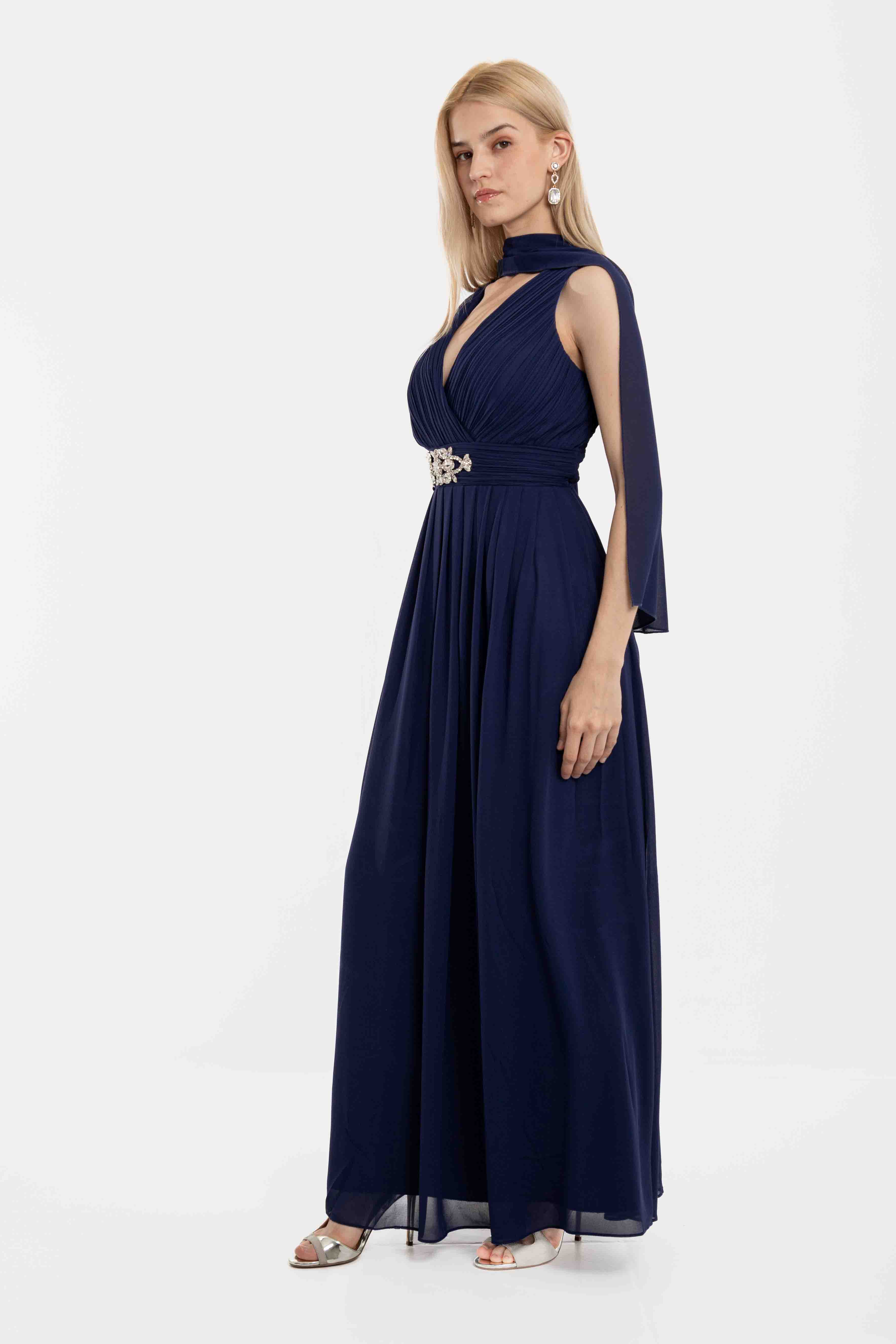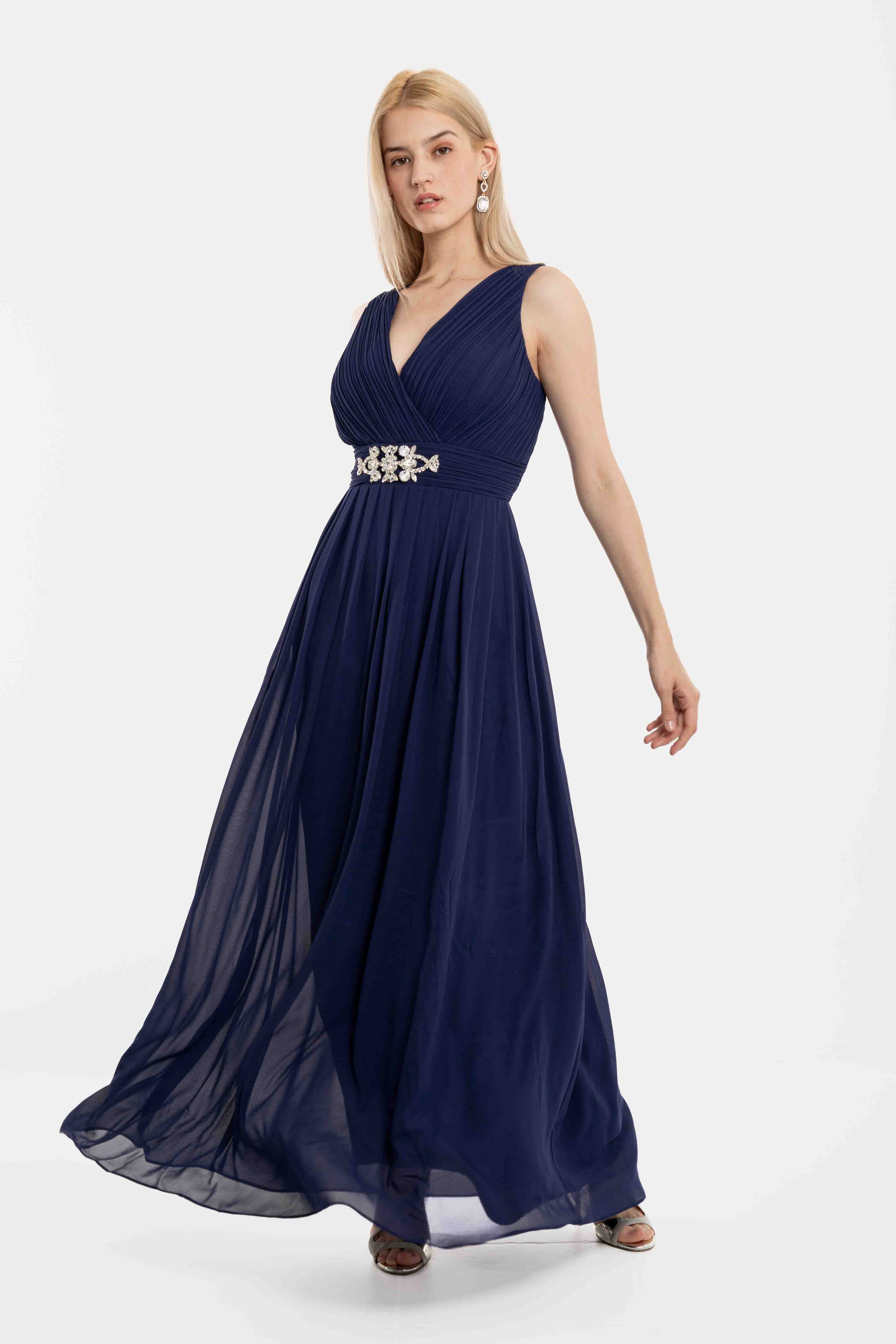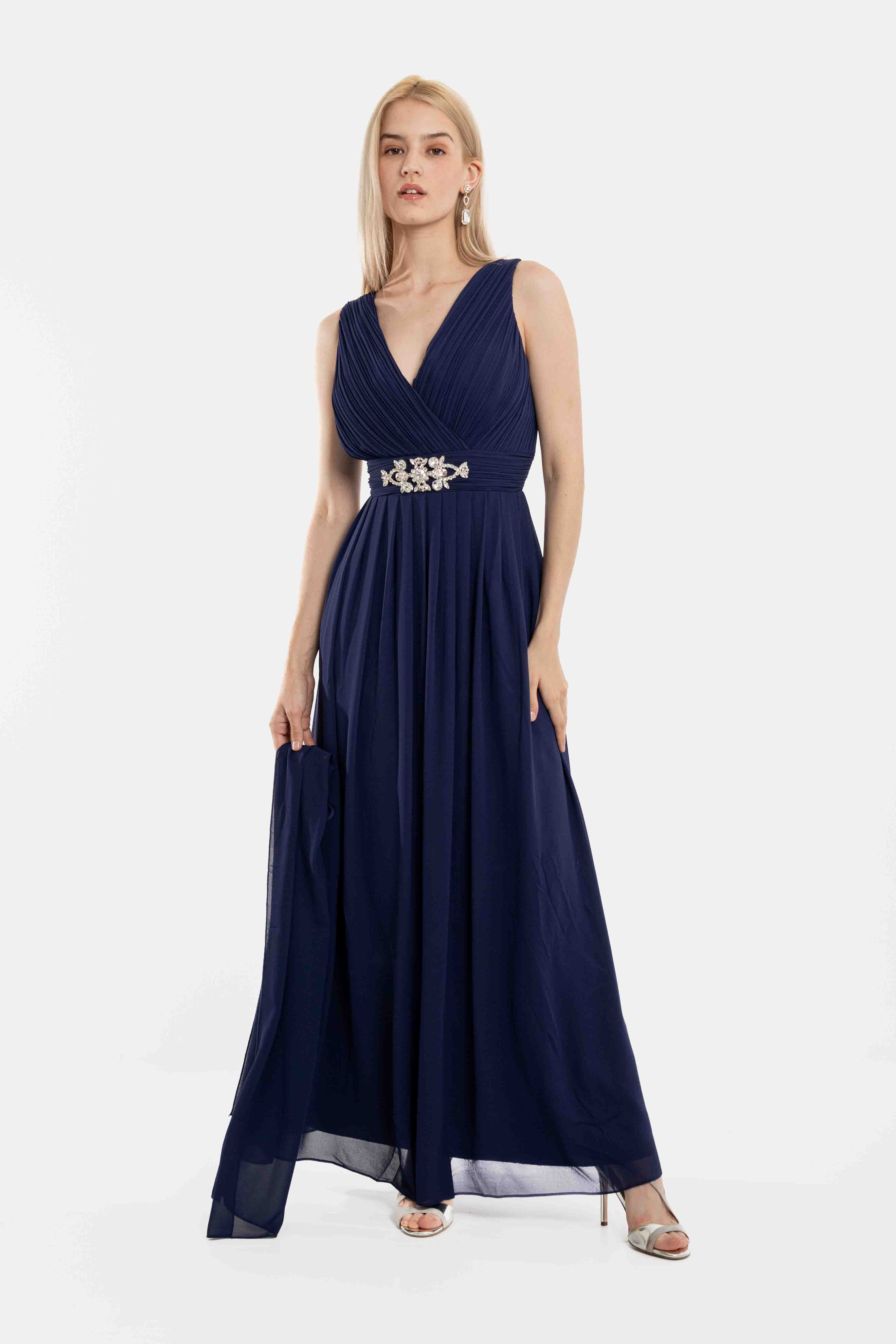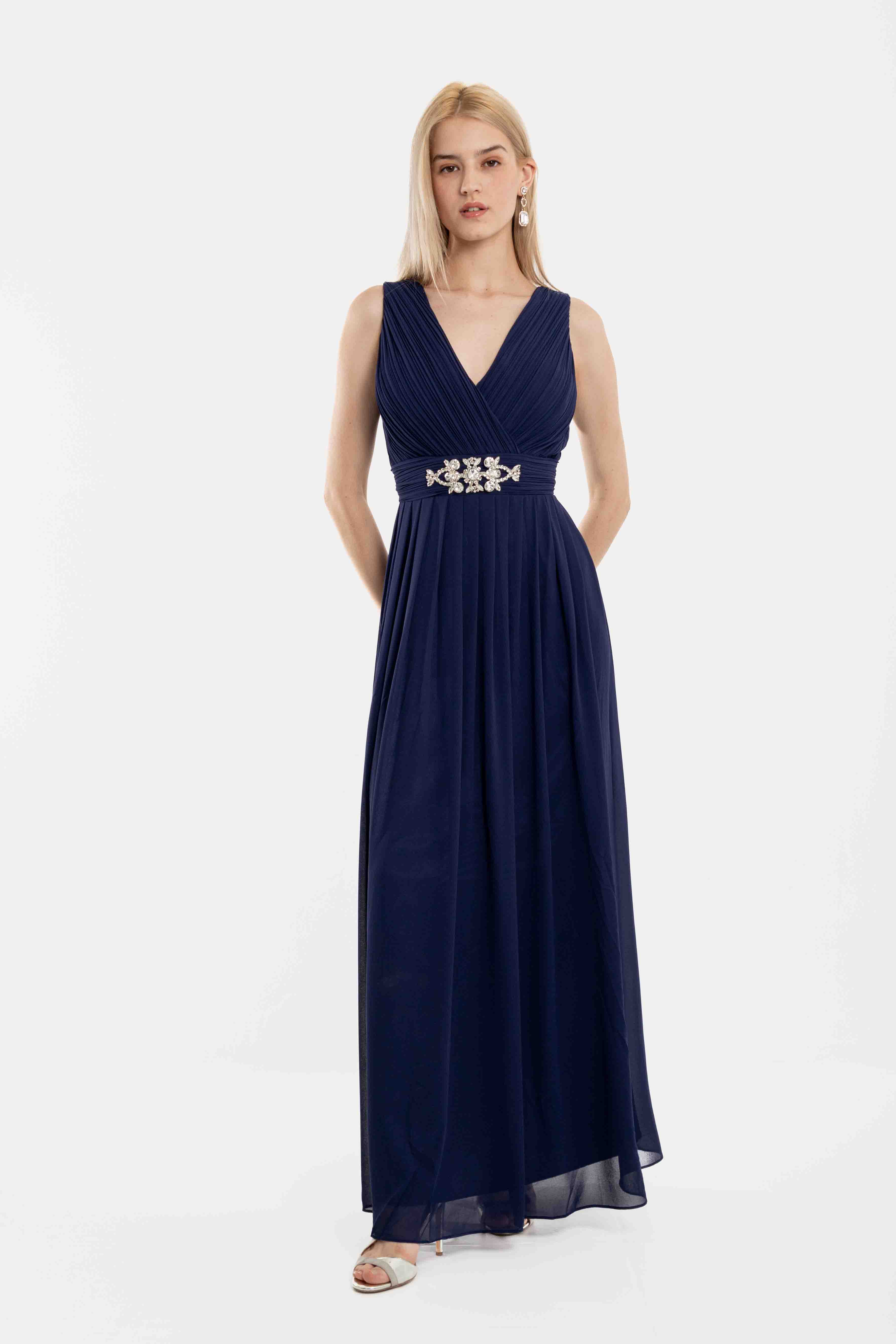 Φόρεμα maxi κρουαζέ με ve στο μπροστά μέρος και διακοσμητικό κόσμημα στην μέση, με σφιγκοφωλιά στο πίσω μέρος και ρυθμιζόμενες ράντες.