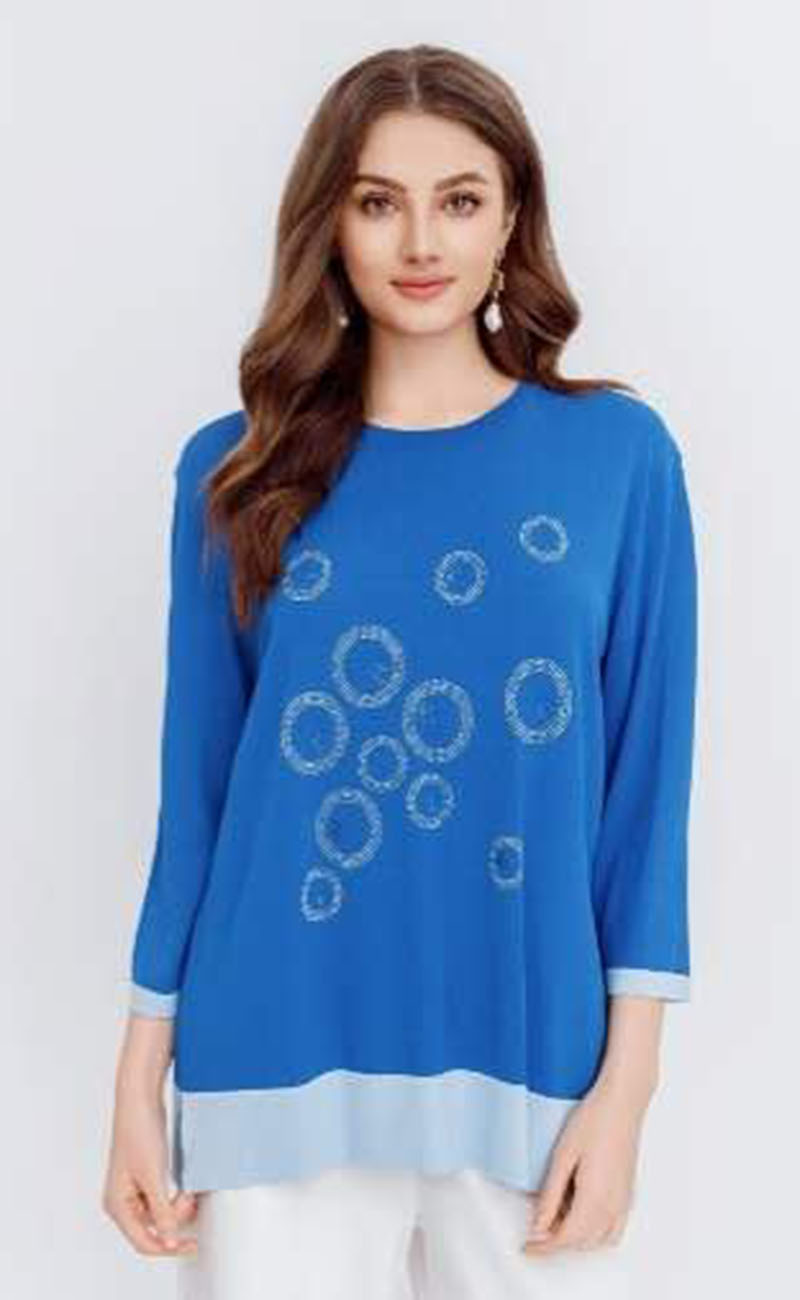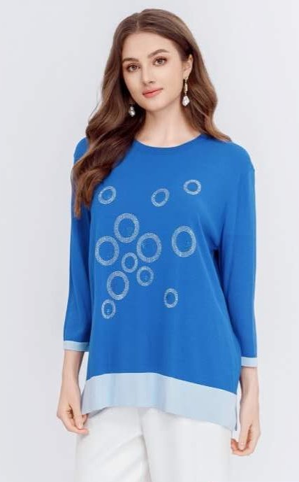 Αυτή η μοντέρνα μπλούζα σε έντονο μπλε χρώμα αποτελεί ένα ξεχωριστό κομμάτι που συνδυάζει την άνεση με τη λάμψη, ιδανικό για να φωτίσει τις καθημερινές σας εμφανίσεις. Το σχέδιο διακοσμείται στο μπροστινό μέρος με αφηρημένους κύκλους από λαμπερά στρασάκια, ενώ οι αντιθέσεις με το ανοιχτό γαλάζιο χρώμα στο τελείωμα του κορμού και των μανικιών προσθέτουν μια σύγχρονη δίχρωμη αισθητική. Διαθέτει στρογγυλή λαιμόκοψη και μανίκια 3/4, ενώ η χαλαρή και άνετη γραμμή της εξασφαλίζει τέλεια εφαρμογή και ελευθερία κινήσεων. Συνδυάζεται εξαιρετικά με λευκά παντελόνια ή το αγαπημένο σας denim, δημιουργώντας ένα look που αποπνέει φρεσκάδα και προσεγμένη κομψότητα όλες τις ώρες της ημέρας.
