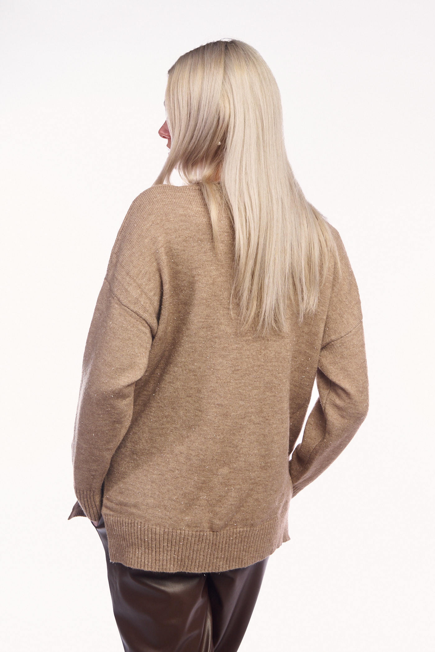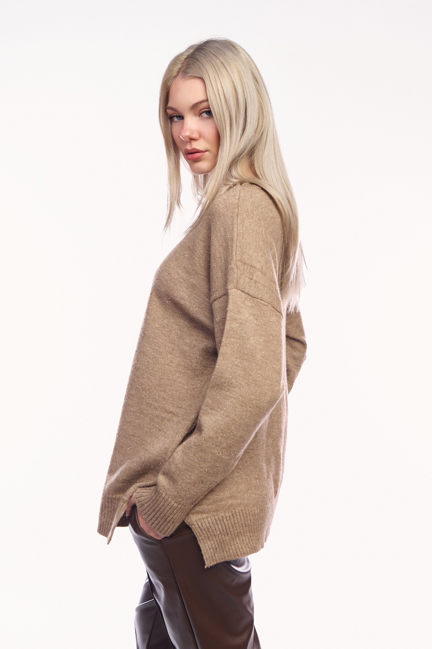 Ένα ζεστό και άνετο πλεκτό πουλόβερ σε oversized γραμμή και μπεζ χρώμα. Το ύφασμα έχει μια διακριτική, νημάτινη υφή (flecked) με μικρές, ανοιχτόχρωμες κηλίδες.