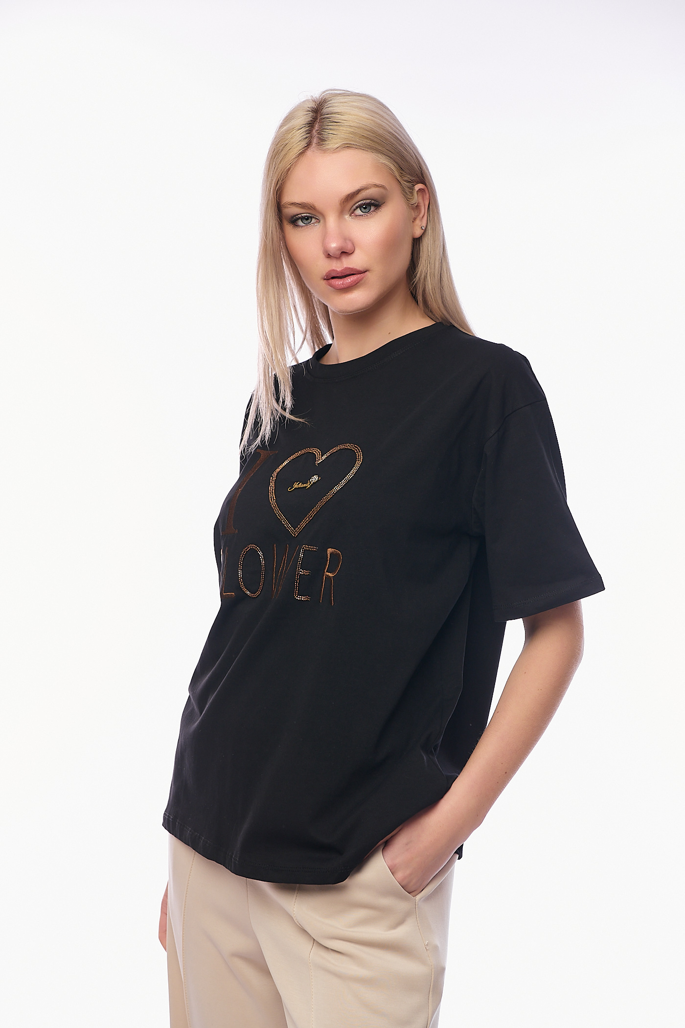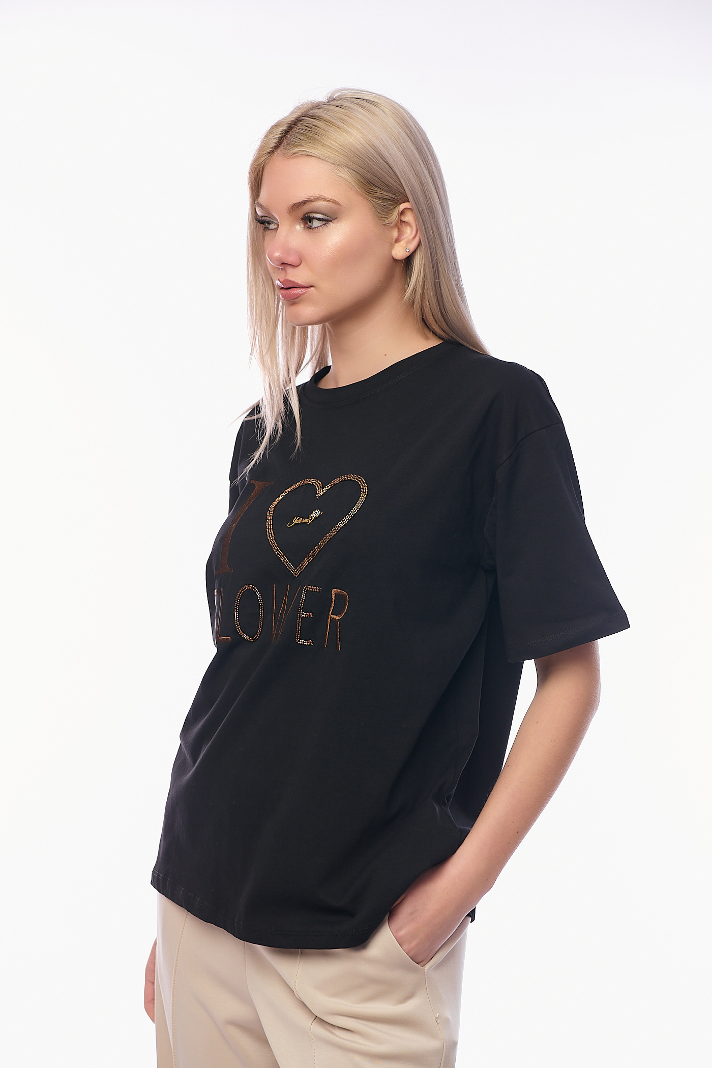Το μπλουζάκι ξεχωρίζει για το κεντρικό του σχέδιο, όπου η φράση "I FLOWER" είναι κεντημένη με ανάγλυφη κλωστή σε ταιριαστό καφέ χρώμα, ενώ μια μεγάλη καρδιά από λαμπερά στρασάκια πλαισιώνει το σύνολο. Διαθέτει κλασική στρογγυλή λαιμόκοψη και άνετα κοντά μανίκια σε oversized γραμμή, προσφέροντας μια χαλαρή σιλουέτα που κολακεύει κάθε σώμα. Το κλασικό μαύρο του χρώμα δημιουργεί έναν υπέροχο συνδυασμό με την μπεζ παντελόνα της συλλογής μας, προσφέροντας ένα σύγχρονο look που αποπνέει θηλυκότητα και φρεσκάδα. Το ύφασμά του είναι ελαστικό.
