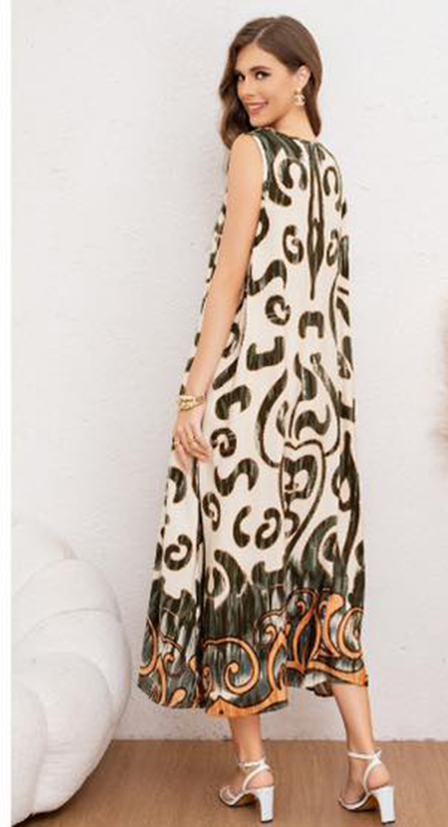 Αυτό το αμάνικο maxi φόρεμα αποτελεί μια ωδή στο ethnic chic, συνδυάζοντας την άνεση με την καλλιτεχνική αισθητική. Το ρούχο διακρίνεται για το εντυπωσιακό ikat-inspired μοτίβο του σε γήινες λαδί και μαύρες αποχρώσεις πάνω σε κρεμ φόντο, ενώ το τελείωμά του στολίζεται από μια φαρδιά bordure με πορτοκαλί λεπτομέρειες που προσθέτουν ζωντάνια στο σύνολο.