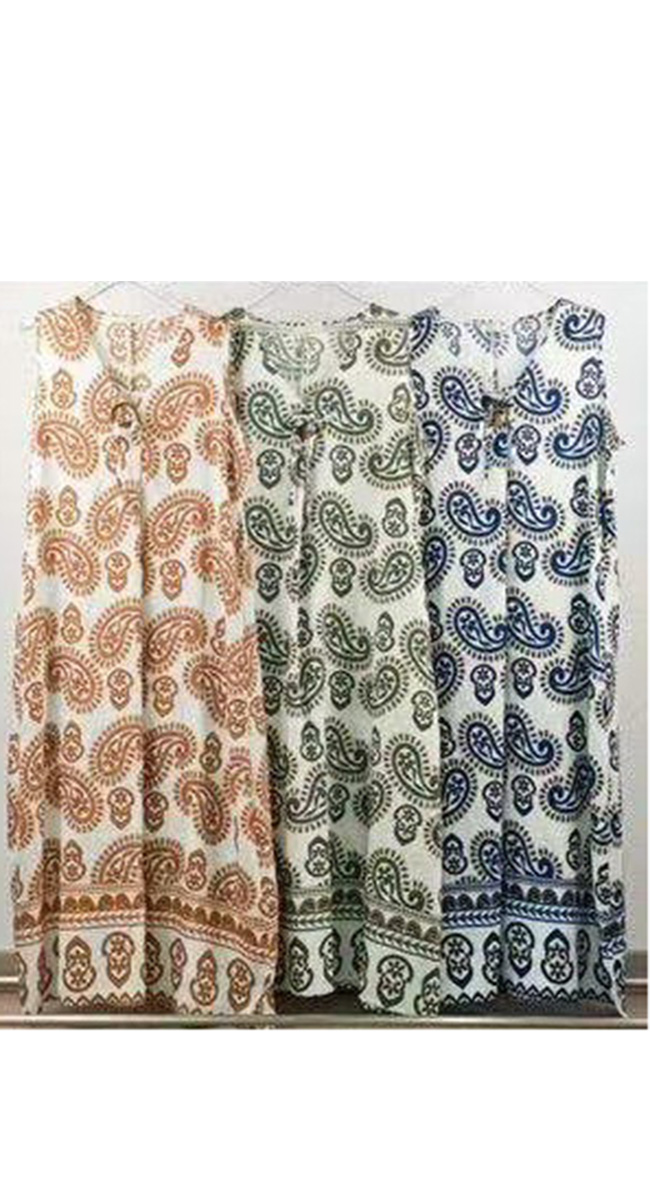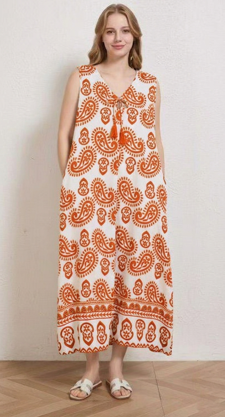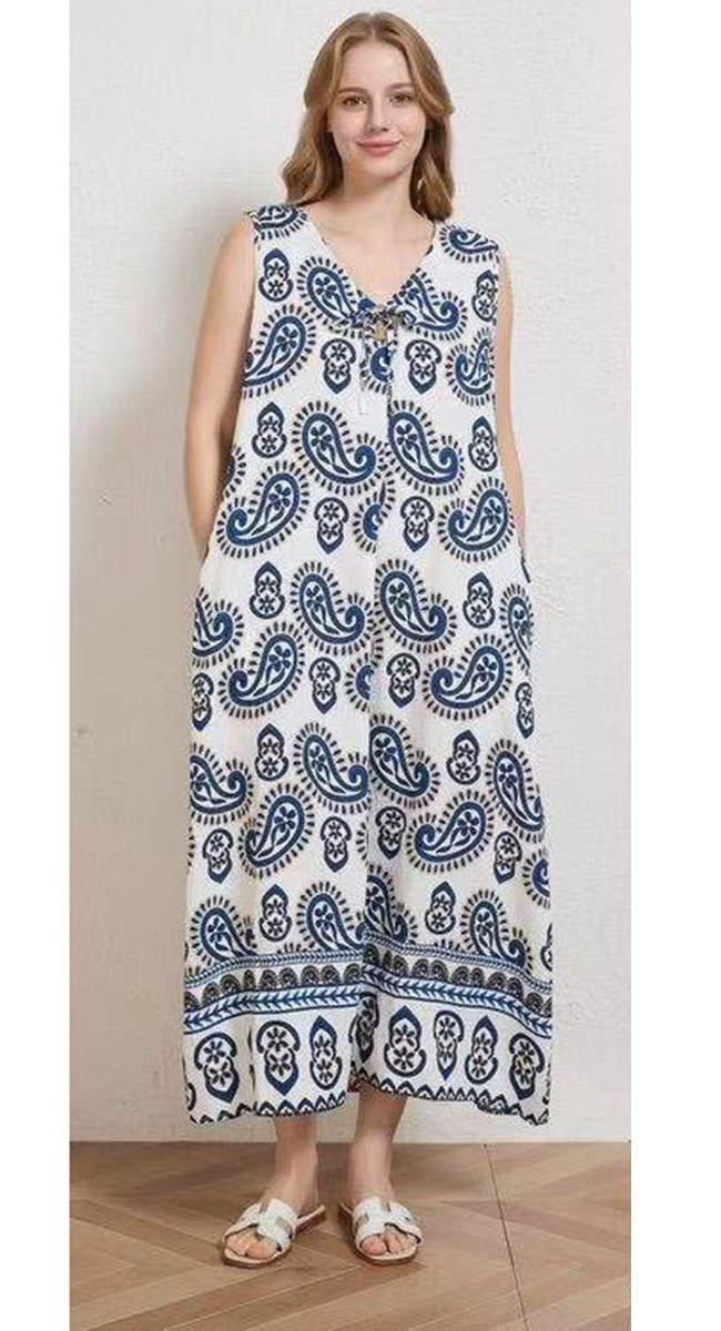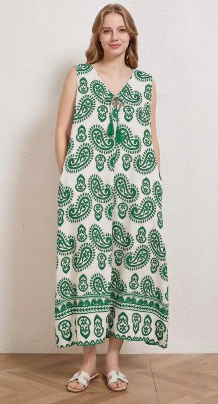 Αυτό το αμάνικο maxi φόρεμα αποπνέει μια αίσθηση διαχρονικής κομψότητας και καλοκαιρινής φρεσκάδας, αποτελώντας την ιδανική επιλογή για άνετες και στιλάτες resort εμφανίσεις. Το ρούχο διακρίνεται για το κλασικό μοτίβο paisley σε έντονη μπλε ή μπεζ ή πράσινη απόχρωση πάνω σε λευκό φόντο, ένας συνδυασμός που παραπέμπει στην αισθητική των ελληνικών νησιών.
