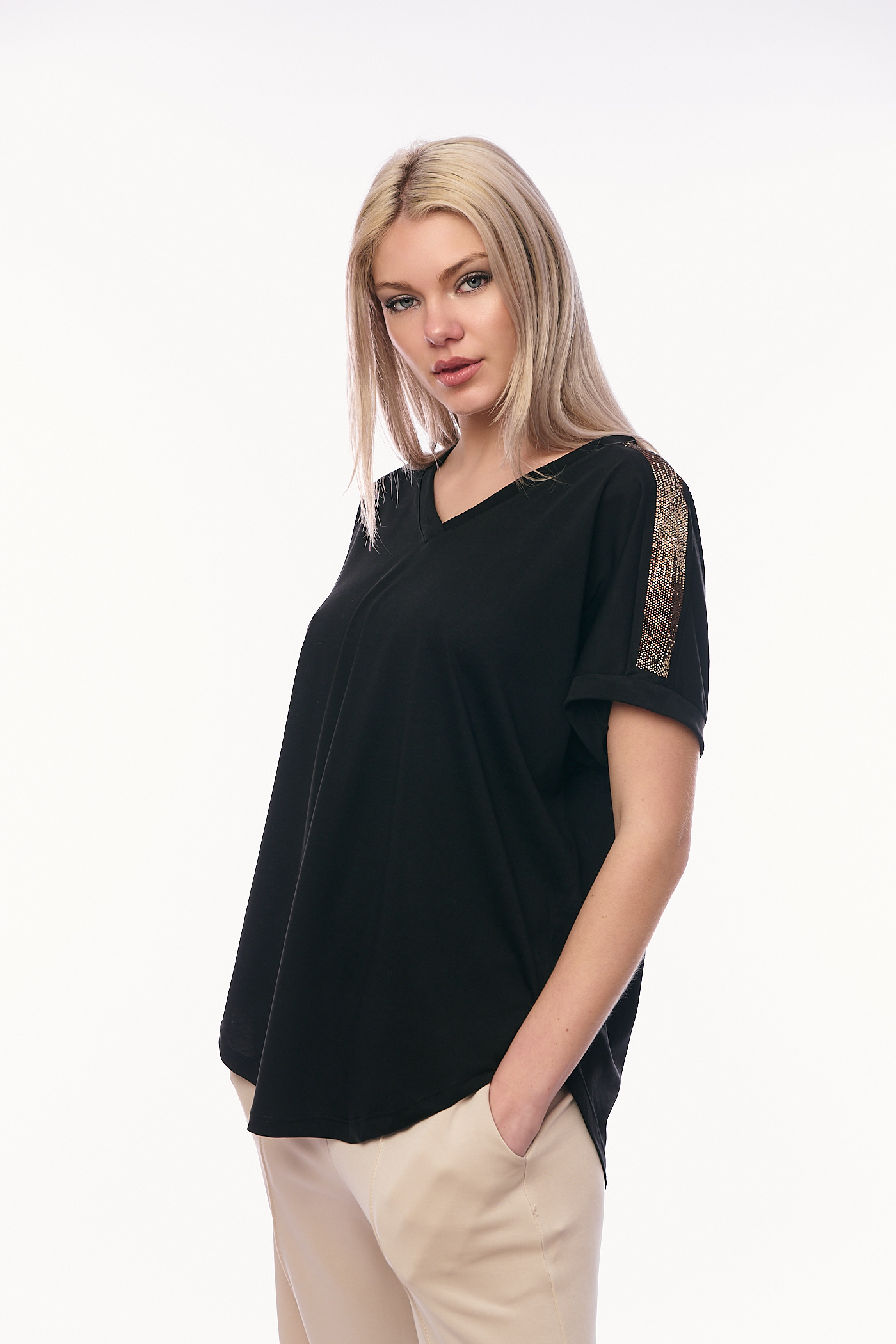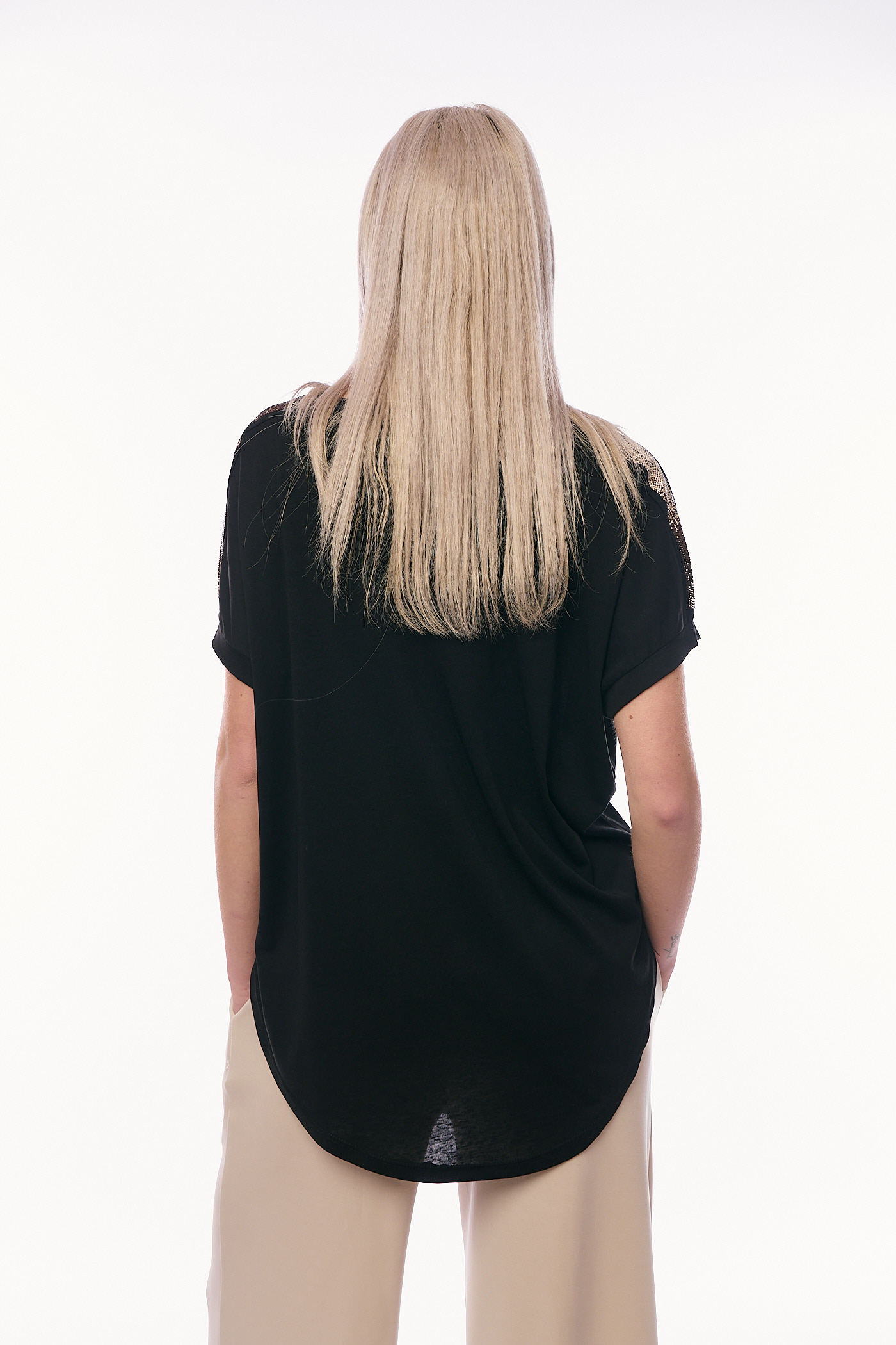 Γυναικείο T-shirt σε Μαύρο Χρώμα με V-λαιμόκοψη και Διακοσμητικές Τρέσες από Στρας στους Ώμους-4468M
