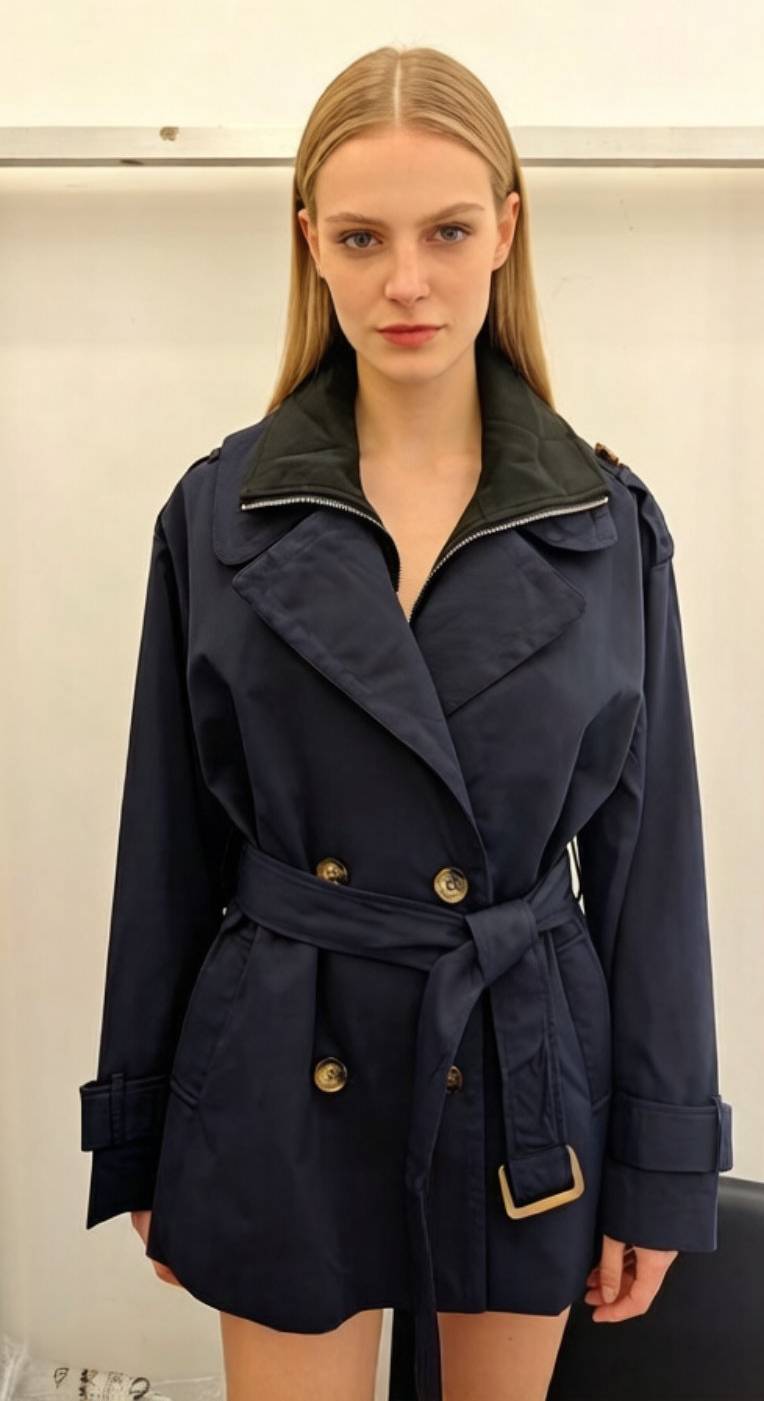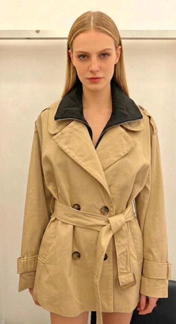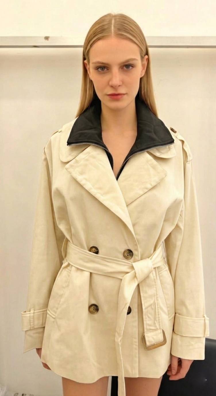 Αυτή η καπαρντίνα ξεχωρίζει για τον ιδιαίτερο γιακά της με το ενσωματωμένο μεταλλικό φερμουάρ, που προσδίδει έναν urban χαρακτήρα στο σχέδιο. Διαθέτει ζώνη στη μέση για να τονίζει τη σιλουέτα, μεγάλα πέτα και διακοσμητικά κουμπιά σε ταρταρούγα όψη. Οι λεπτομέρειες στους καρπούς και οι επωμίδες ολοκληρώνουν το αυστηρό αλλά ταυτόχρονα θηλυκό look, καθιστώντας την ιδανική για κάθε ώρα της ημέρας.