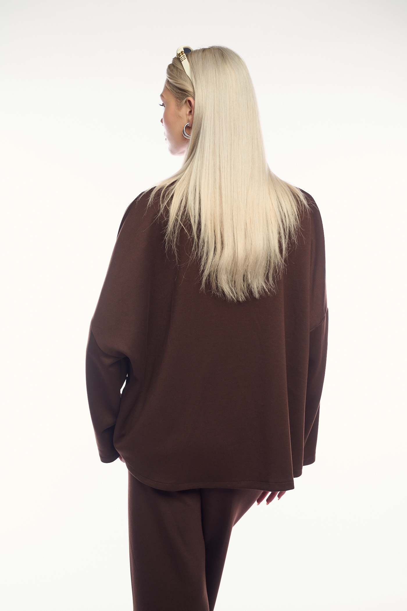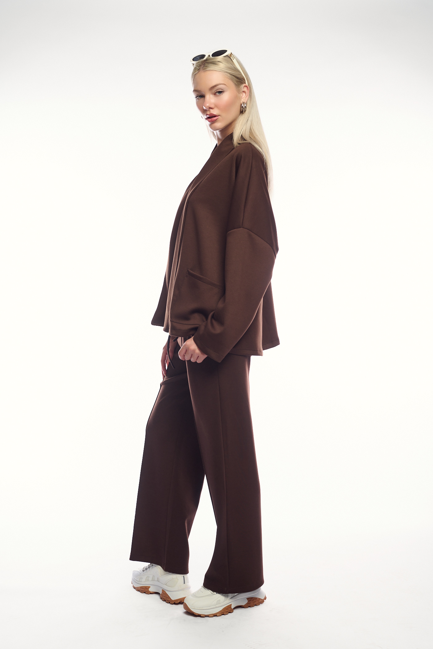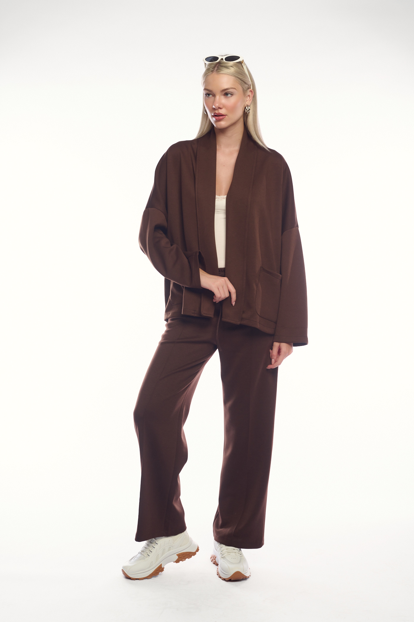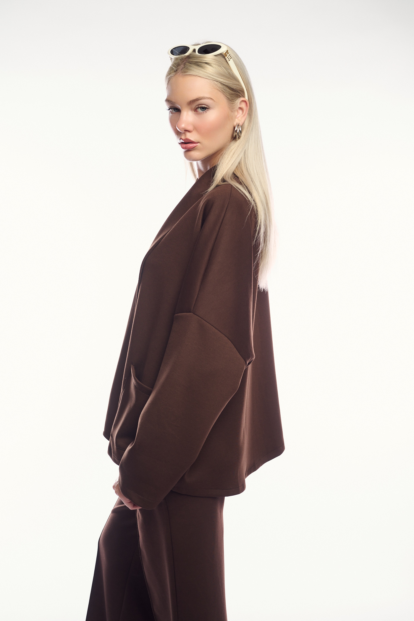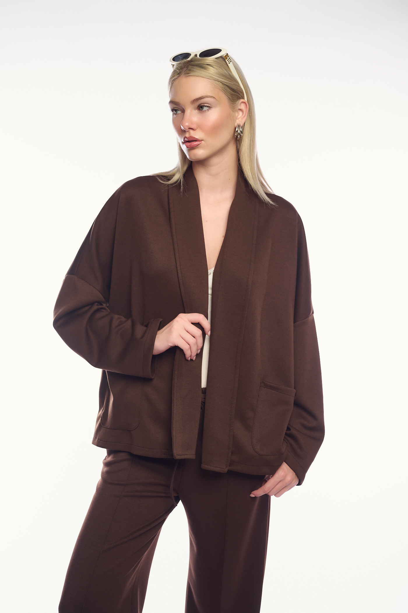 Πρόκειται για μια κομψή, κοντή ζακέτα σε σκούρα καφέ απόχρωση. Διαθέτει γιακά σε στυλ σάλι και μεγάλα, πρακτικά τσεπάκια στο μπροστινό μέρος. Το ρούχο έχει χαλαρή, ίσια γραμμή και μακριά μανίκια, προσφέροντας άνεση και στυλ. Φοριέται ανοιχτή, ιδανική για layering.