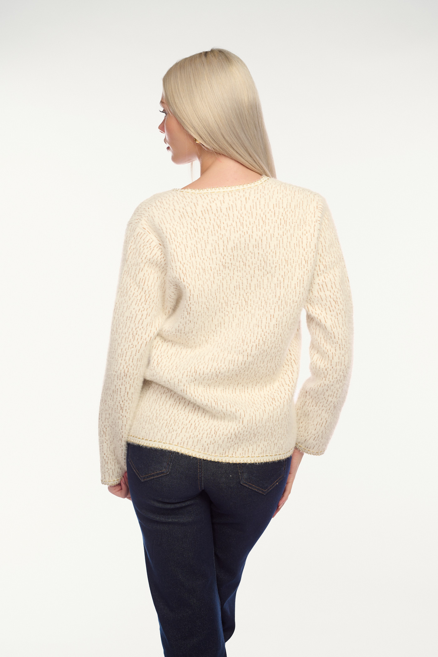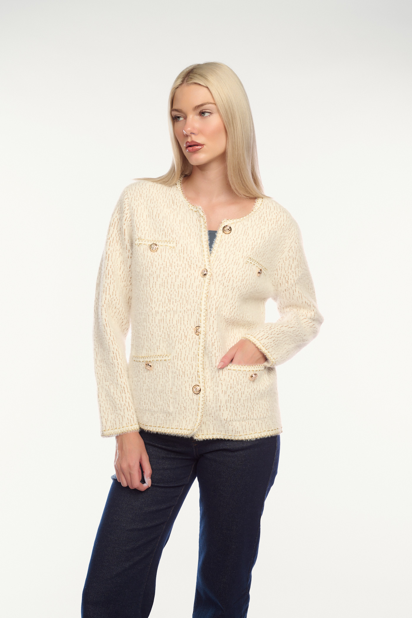 Πρόκειται για μια κοντή ζακέτα σε εκρού απόχρωση, με έντονη υφή στο πλεκτό της ύφασμα. Η ζακέτα είναι διακοσμημένη με χρυσά κουμπιά στο μπροστινό μέρος και έχει χρυσή λεπτή ρίγα που περιβάλλει το περίγραμμα των τσεπών και το τελείωμα του ρούχου. Το ρούχο διαθέτει δύο διακριτικές μπροστινές τσέπες.