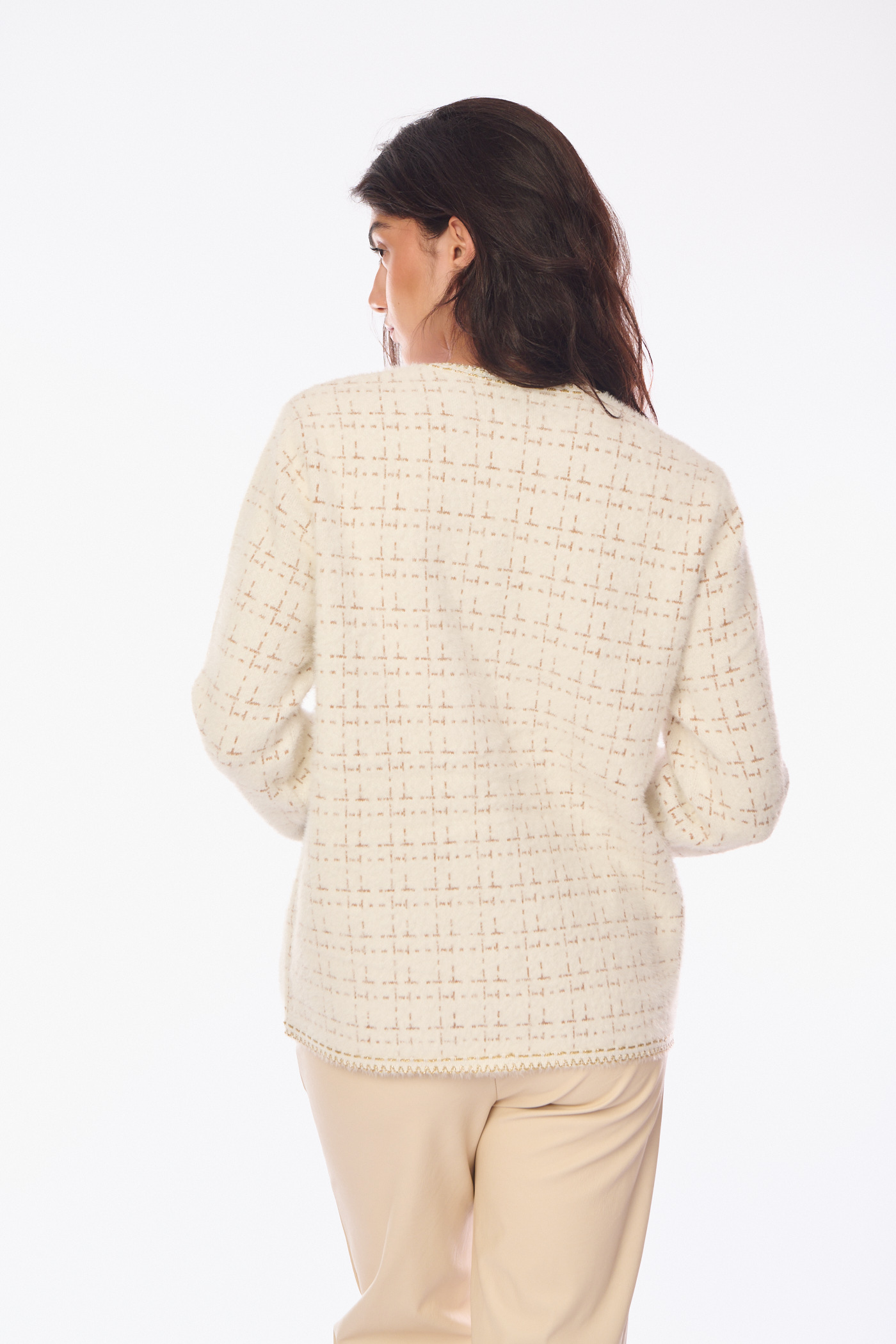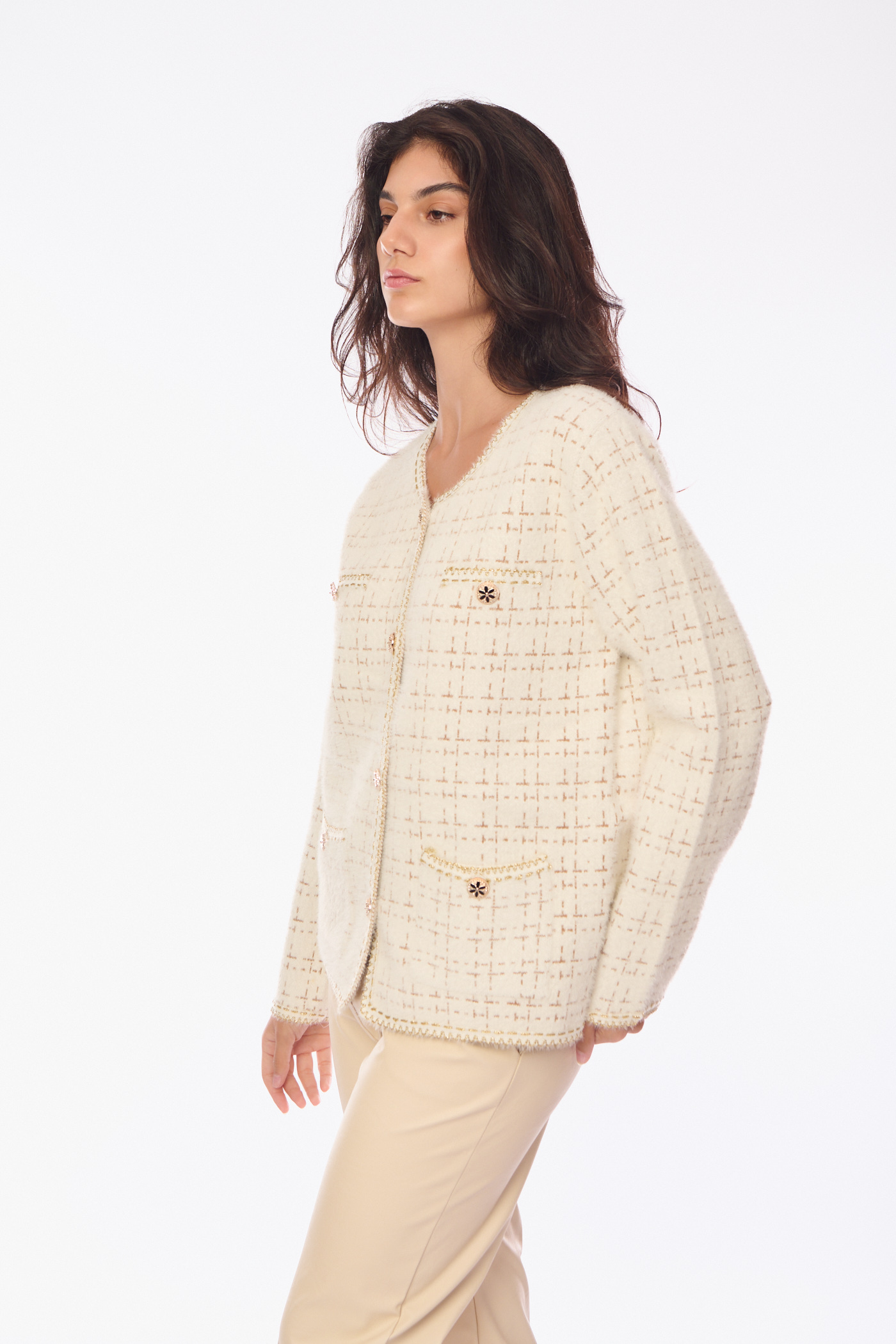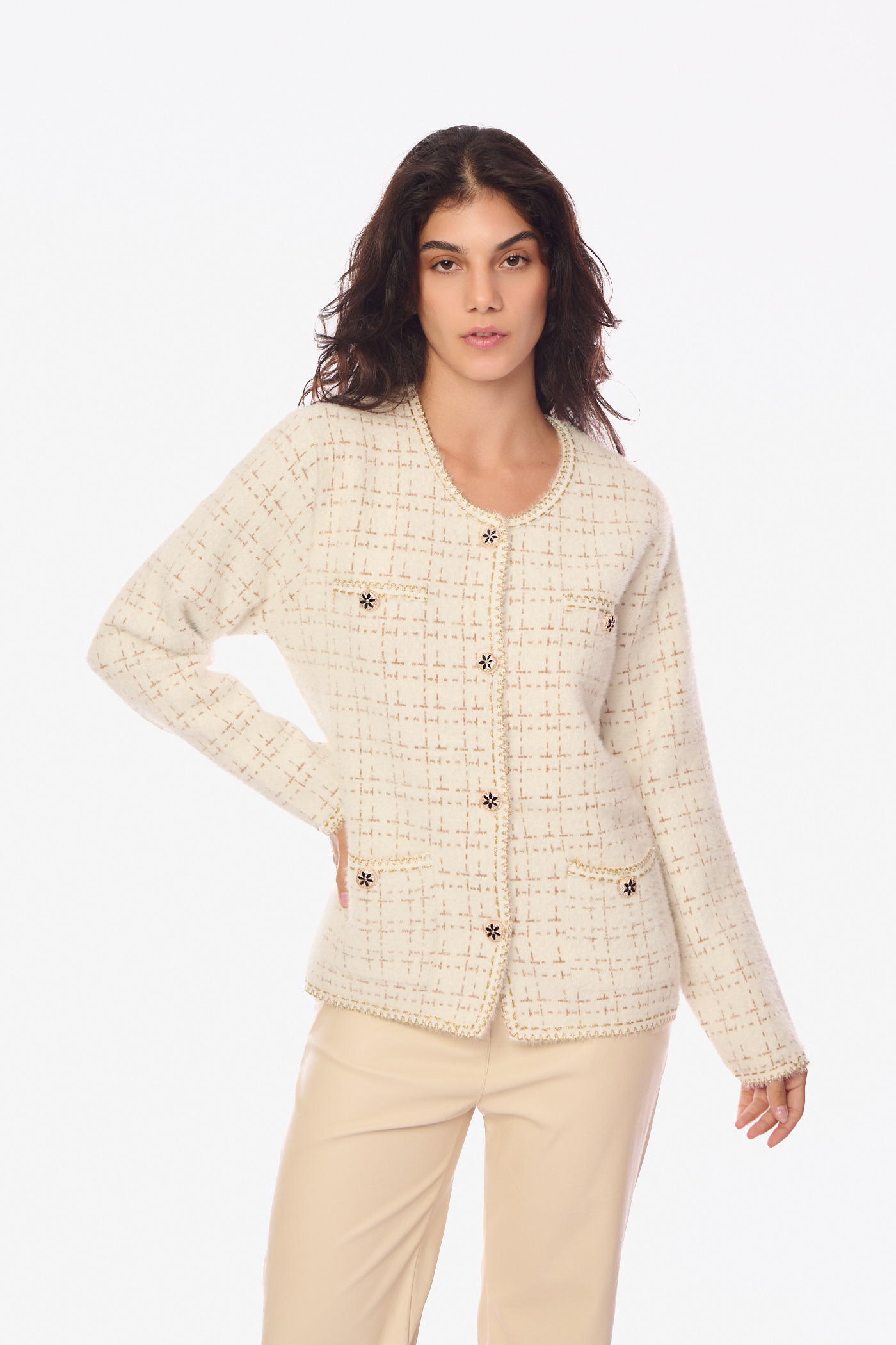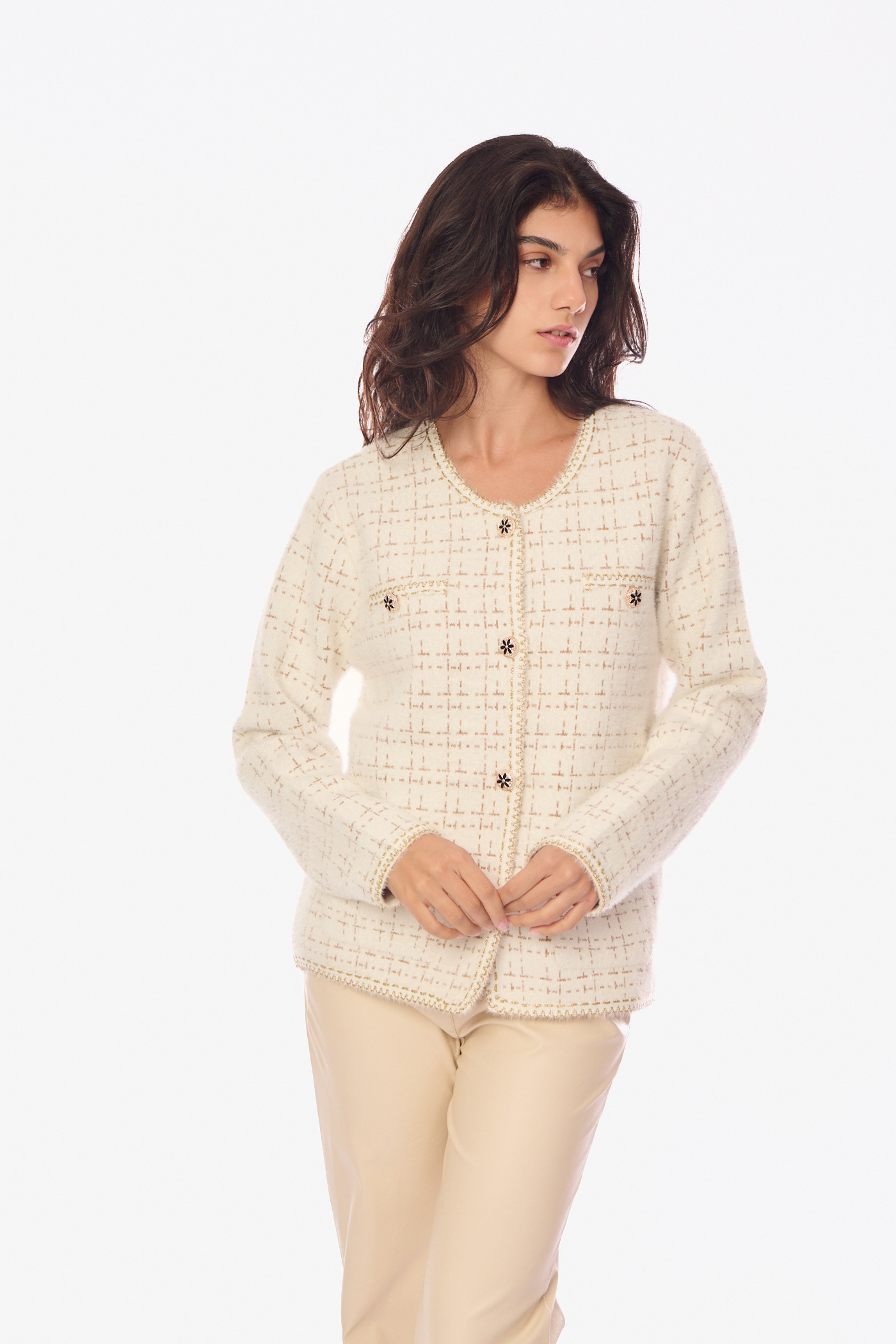 Μία κομψή, κοντή ζακέτα σε στυλ τουίντ, σε μπεζ χρώμα. Διαθέτει στρογγυλή λαιμόκοψη και μακριά μανίκια. Το σχέδιό του θυμίζει πλέξη, με διακοσμητικές λεπτομέρειες σε χρυσό στα τελειώματα και στις τσέπες, και κλείνει μπροστά με διακριτικά, στρογγυλά κουμπιά.