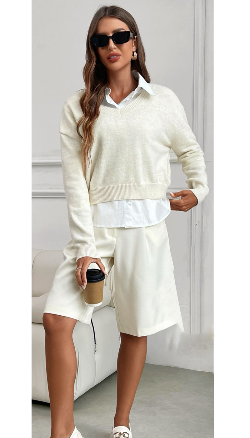 Ένας κομψός και μοντέρνος συνδυασμός, που αποτελείται από ένα κοντό, πλεκτό πουλόβερ σε απαλό εκρού χρώμα με ενσωματωμένο λευκό πουκάμισο. Το πουλόβερ διαθέτει V-λαιμόκοψη. Το πουκάμισο προεξέχει στο κάτω μέρος και στους καρπούς, δημιουργώντας ένα δημοφιλές layered look.