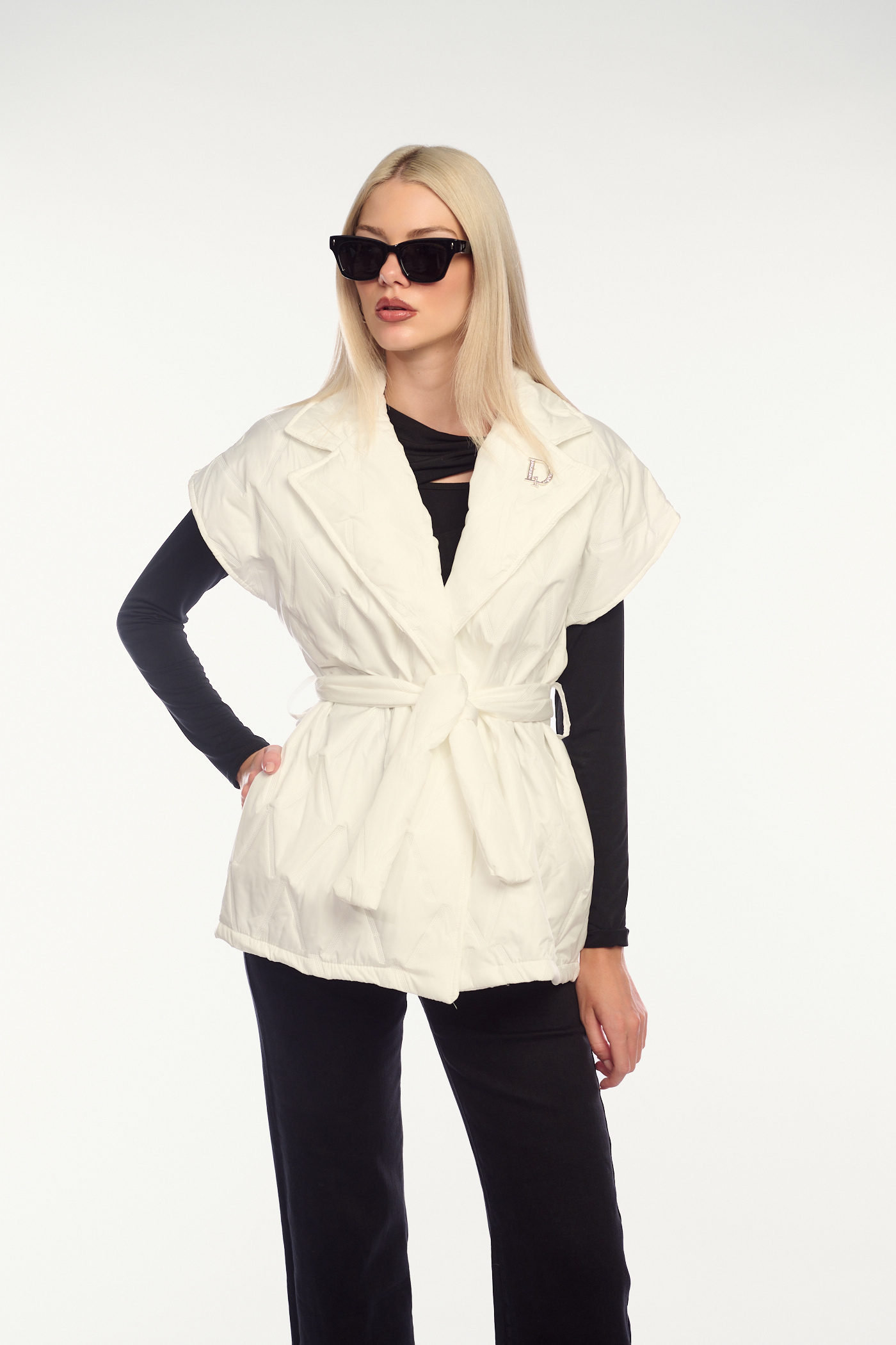 Πρόκειται για ένα κοντό, αμάνικο μπουφάν σε λευκό χρώμα, με καπιτονέ υφή και μεγάλο γιακά. Το μπουφάν διαθέτει μια ζώνη από το ίδιο ύφασμα για να δένει στη μέση και να τονίζει τη σιλουέτα. Έχει επίσης μια διακριτική, διακοσμητική καρφίτσα σε ασημί χρώμα στο πέτο.