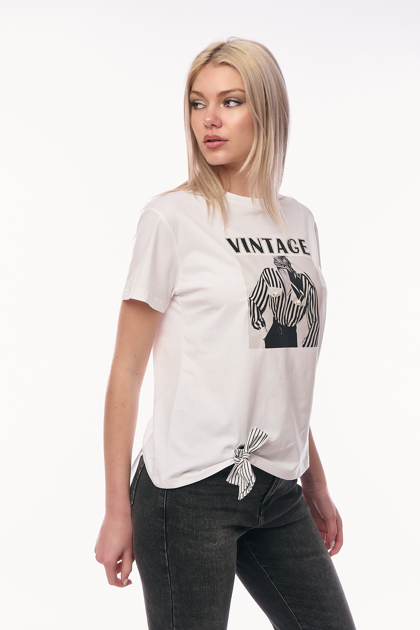 Λευκό T-shirt με Vintage Print & Λεπτομέρεια Κόμπο-P199 Λευκό T-shirt με Vintage Print & Λεπτομέρεια Κόμπο-P199 Λευκό T-shirt με Vintage Print & Λεπτομέρεια Κόμπο-P199