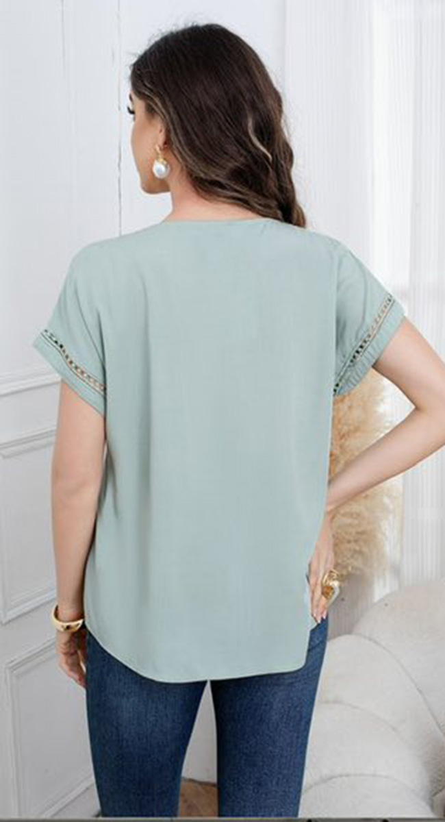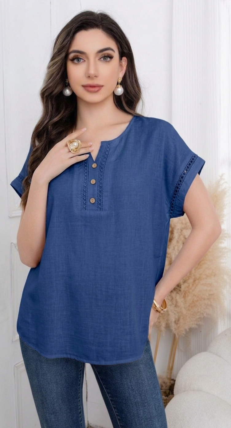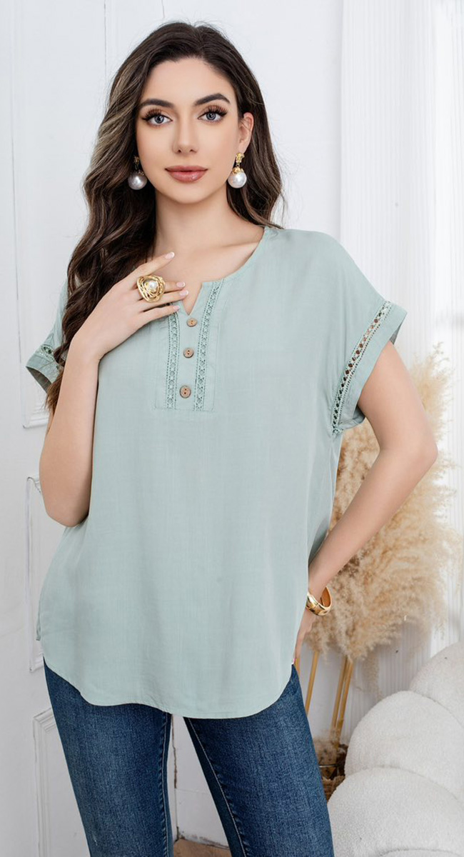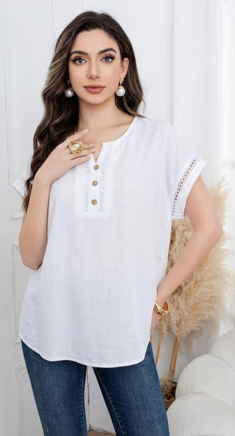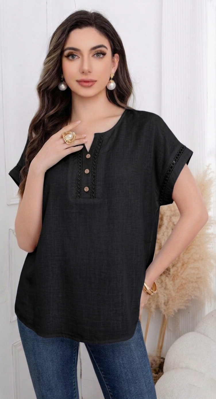 Αυτή η μπλούζα διαθέτει διακριτική λαιμόκοψη V που καταλήγει σε πατιλέτα με τρία ξύλινα κουμπιά, προσφέροντας ένα boho-chic ύφος. Το σχέδιο αναβαθμίζεται με κάθετες φάσες δαντέλας στο μπροστινό μέρος και στα τελειώματα των μανικιών, προσθέτοντας φινέτσα και θηλυκότητα. Με άνετη γραμμή και δροσερό ύφασμα, είναι το ιδανικό κομμάτι για τις ζεστές μέρες του καλοκαιριού. Διαθέσιμη σε λευκό, μαύρο, μπεζ,, μπλε και πράσινο χρώμα.