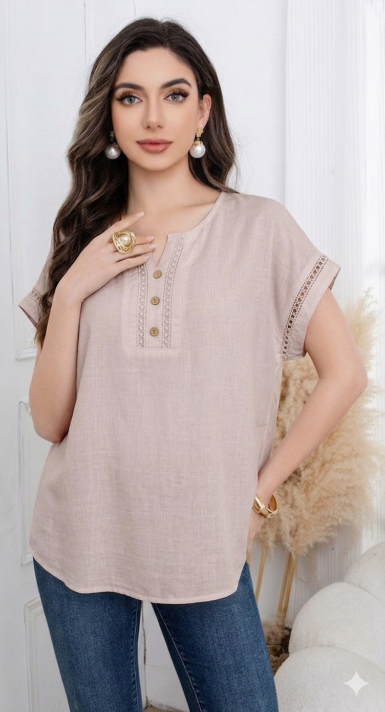 Λινή Μπλούζα με Δαντέλα & Ξύλινα Κουμπιά-A26381