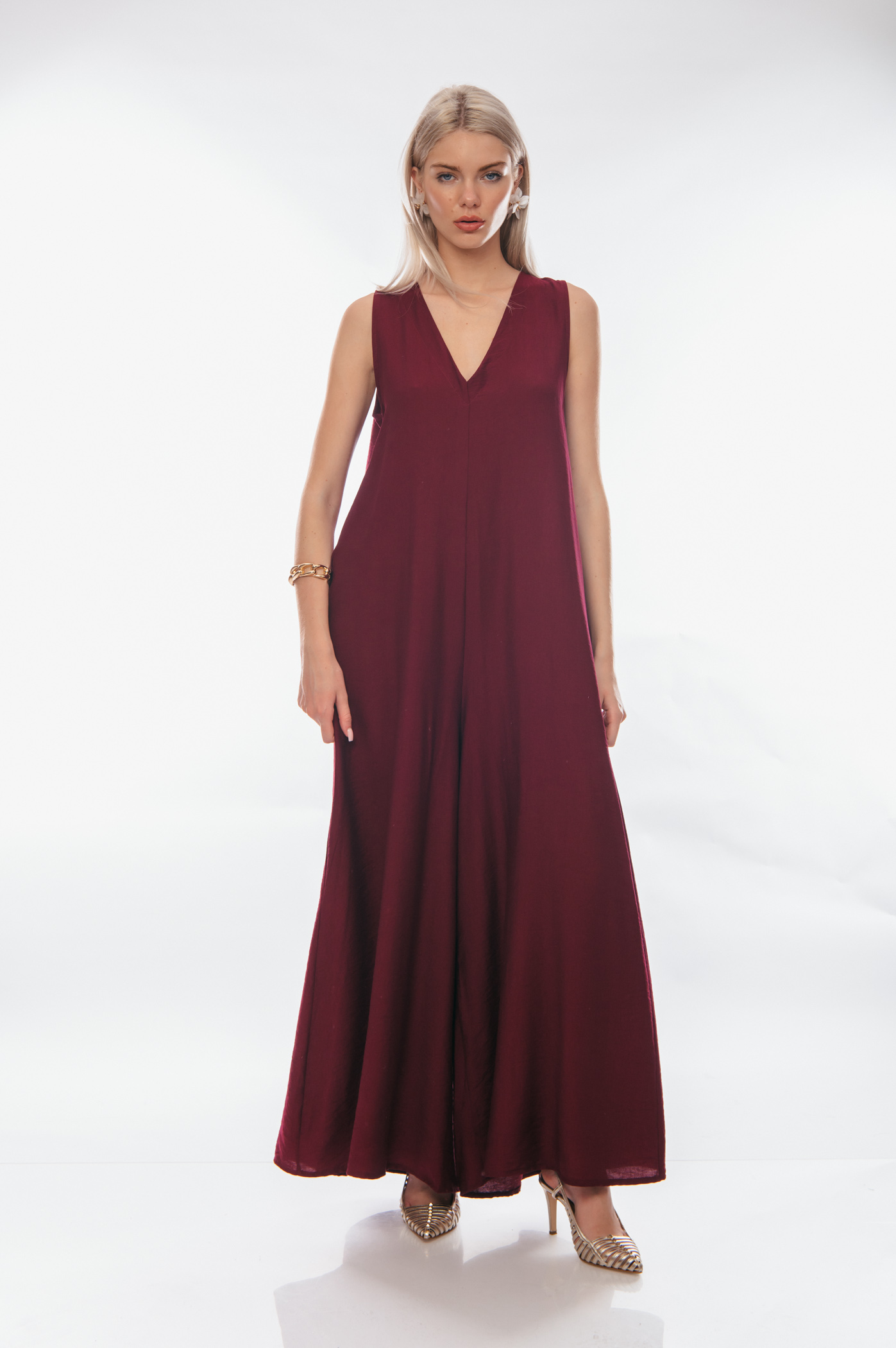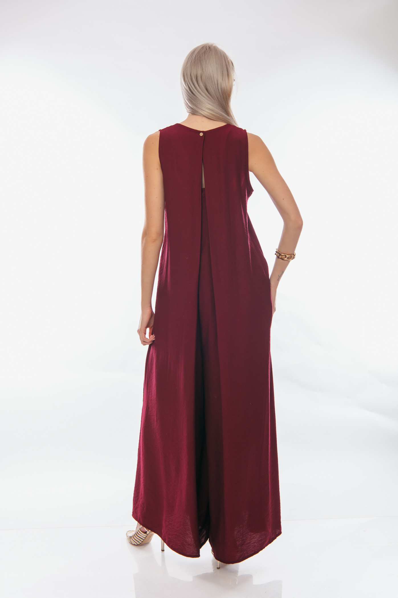 Εντυπωσιάστε με αυτό το μακριά, αέρινη ολόσωμη φόρμα σε βαθύ μπορντό χρώμα. Με V λαιμόκοψη και αμάνικη γραμμή, προσφέρει κομψότητα και άνεση σε κάθε σας εμφάνιση. Η ίσια, χαλαρή γραμμή του (που καλύπτει έως XL νούμερο) κολακεύει κάθε σωματότυπο, ενώ η λεπτομέρεια στην πλάτη προσθέτει μια διακριτική πινελιά. Στν πλάτη κουμπόνει μία κουφόπιετα που κατεβαίνει και ανοίγει προς τα κάτω.